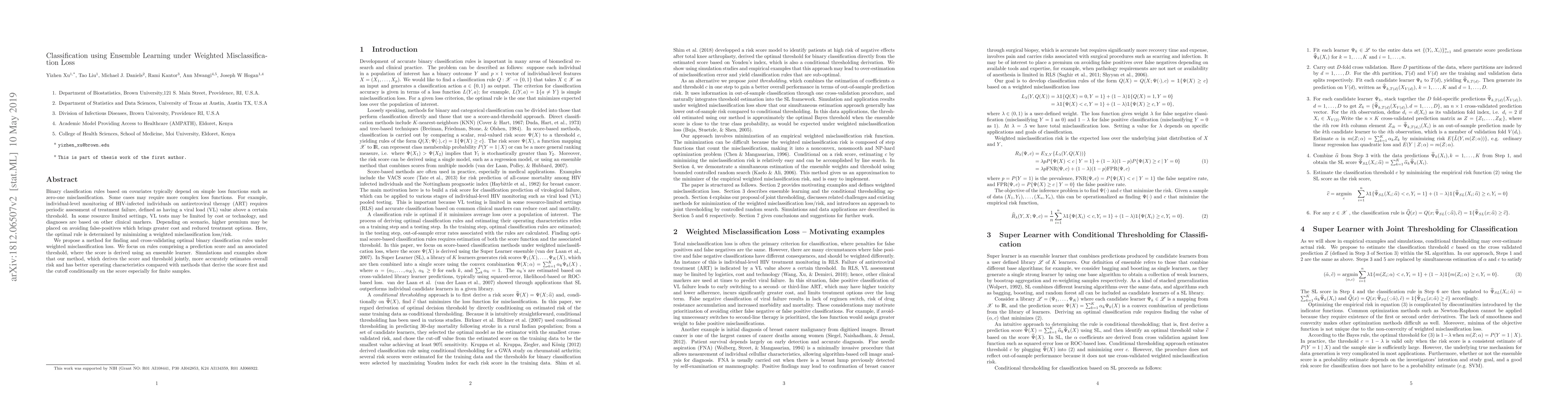Binary classification rules based on covariates typically depend on simple loss functions such as zero-one misclassification. Some cases may require more complex loss functions. For example, individual-level monitoring of HIV-infected individuals on antiretroviral therapy (ART) requires periodic assessment of treatment failure, defined as having a viral load (VL) value above a certain threshold. In some resource limited settings, VL tests may be limited by cost or technology, and diagnoses are based on other clinical markers. Depending on scenario, higher premium may be placed on avoiding false-positives which brings greater cost and reduced treatment options. Here, the optimal rule is determined by minimizing a weighted misclassification loss/risk. We propose a method for finding and cross-validating optimal binary classification rules under weighted misclassification loss. We focus on rules comprising a prediction score and an associated threshold, where the score is derived using an ensemble learner. Simulations and examples show that our method, which derives the score and threshold jointly, more accurately estimates overall risk and has better operating characteristics compared with methods that derive the score first and the cutoff conditionally on the score especially for finite samples.