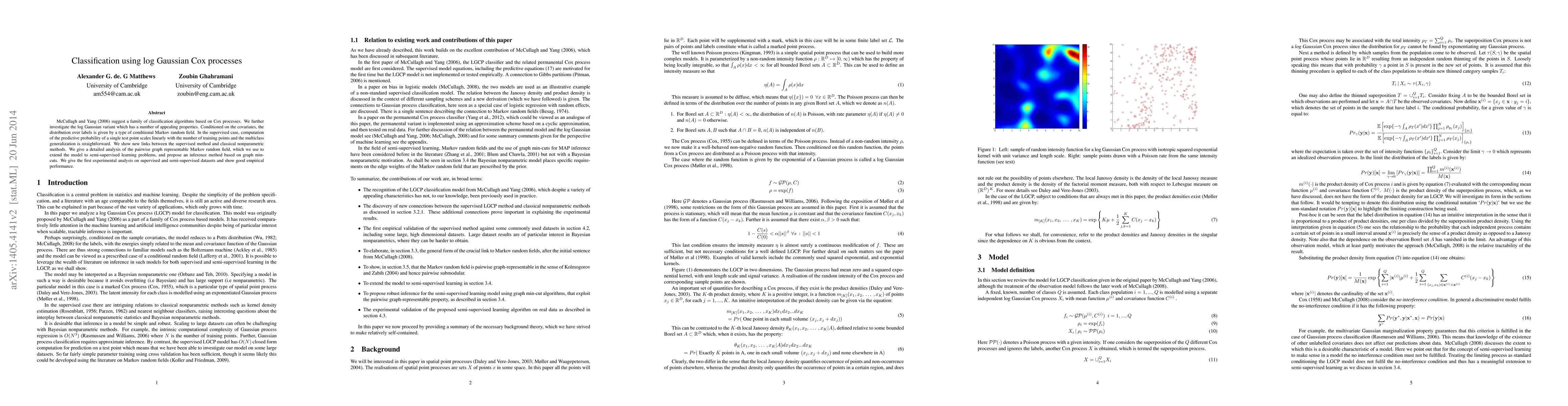 McCullagh and Yang (2006) suggest a family of classification algorithms based on Cox processes. We further investigate the log Gaussian variant which has a number of appealing properties. Conditioned on the covariates, the distribution over labels is given by a type of conditional Markov random field. In the supervised case, computation of the predictive probability of a single test point scales linearly with the number of training points and the multiclass generalization is straightforward. We show new links between the supervised method and classical nonparametric methods. We give a detailed analysis of the pairwise graph representable Markov random field, which we use to extend the model to semi-supervised learning problems, and propose an inference method based on graph min-cuts. We give the first experimental analysis on supervised and semi-supervised datasets and show good empirical performance.
