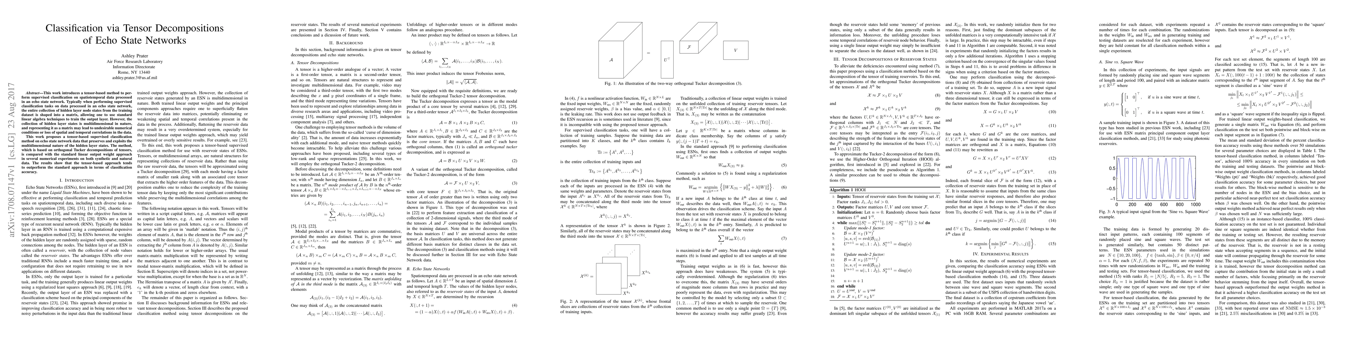 This paper proposes a tensor-based method for supervised classification using echo state networks, utilizing orthogonal Tucker decompositions to better preserve multidimensional data correlations. Experimental results indicate that this tensor approach outperforms traditional matrix-based methods in classification accuracy.
