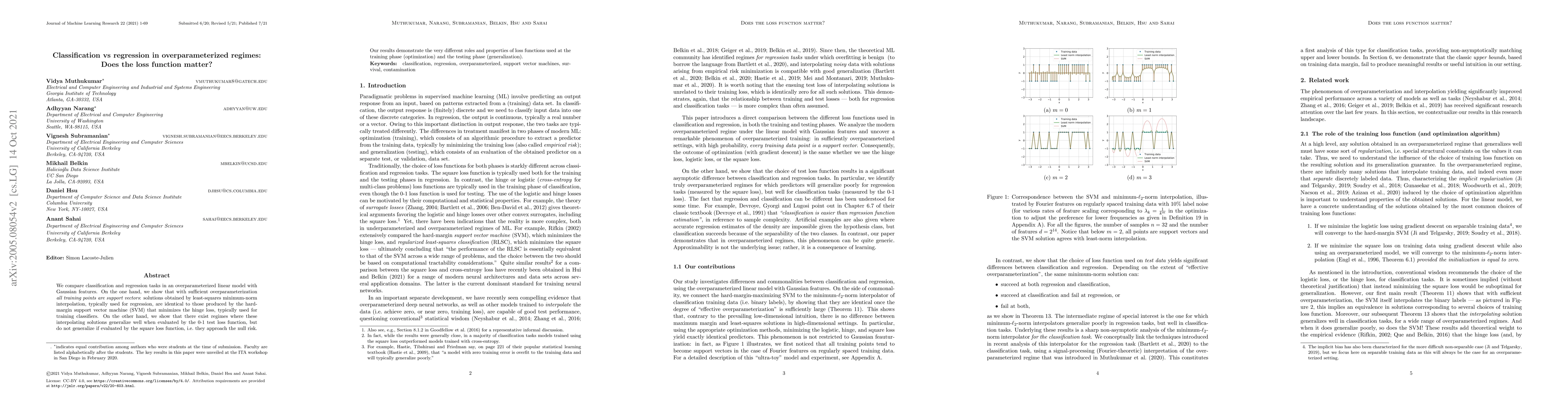 We compare classification and regression tasks in an overparameterized linear model with Gaussian features. On the one hand, we show that with sufficient overparameterization all training points are support vectors: solutions obtained by least-squares minimum-norm interpolation, typically used for regression, are identical to those produced by the hard-margin support vector machine (SVM) that minimizes the hinge loss, typically used for training classifiers. On the other hand, we show that there exist regimes where these interpolating solutions generalize well when evaluated by the 0-1 test loss function, but do not generalize if evaluated by the square loss function, i.e. they approach the null risk. Our results demonstrate the very different roles and properties of loss functions used at the training phase (optimization) and the testing phase (generalization).