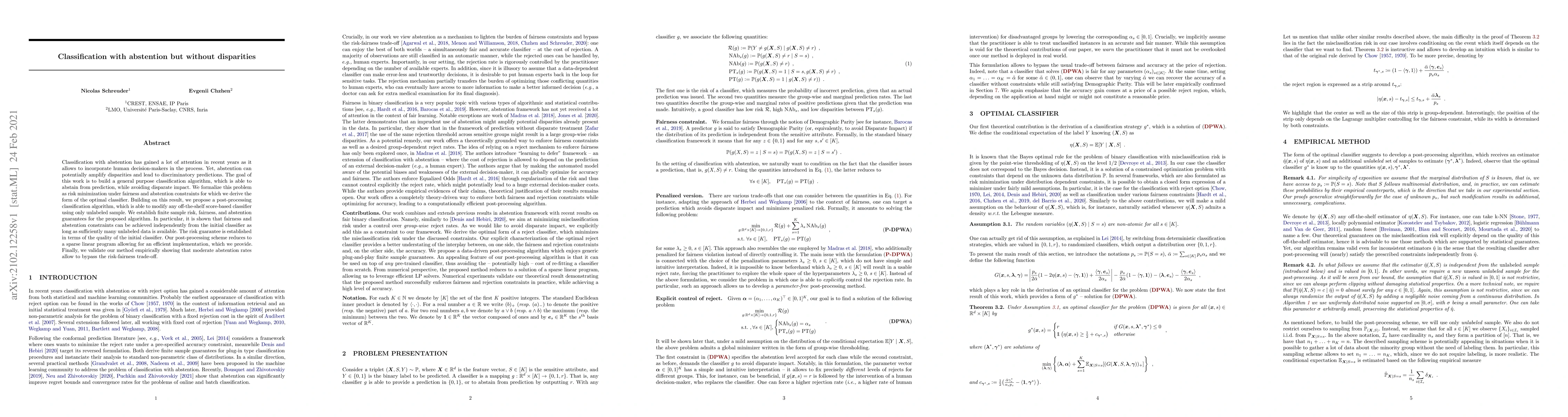 This paper proposes a classification algorithm that can abstain from prediction while ensuring fairness and avoiding disparate impact. It introduces a post-processing method that modifies any existing classifier to meet these constraints using only unlabeled data, with guarantees on risk, fairness, and abstention.