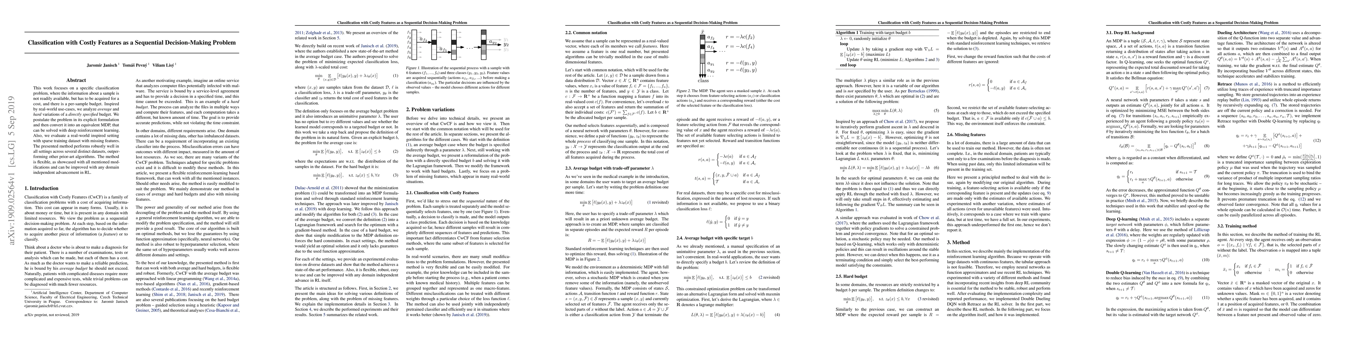 This research paper presents a method for classification problems with costly features, using sequential decision-making and deep reinforcement learning. It performs robustly well across multiple datasets and is flexible, making it suitable for real-world applications.
