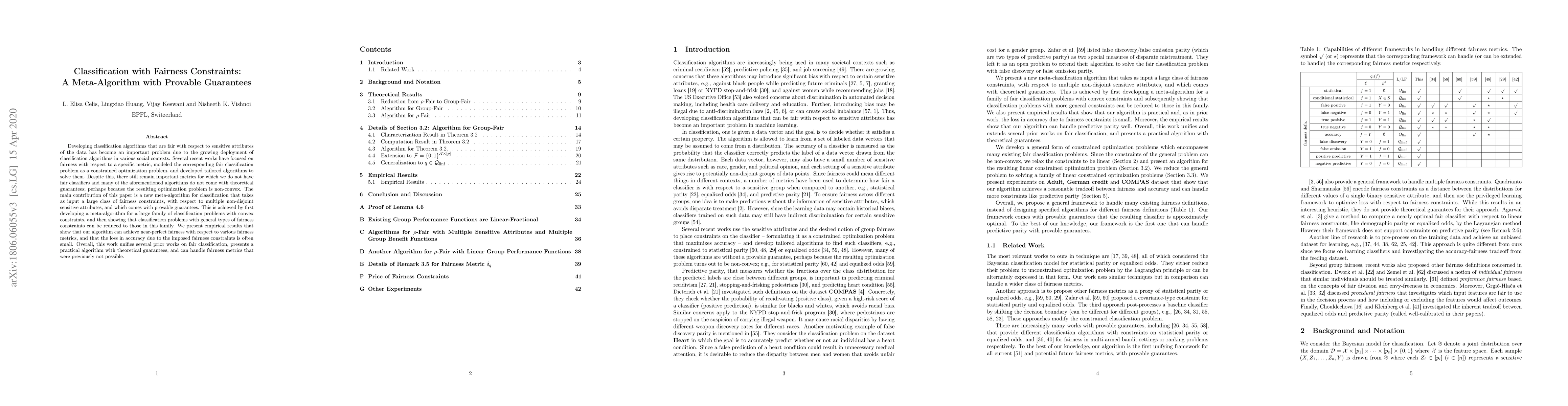 The paper presents a meta-algorithm for classification with fairness constraints, providing provable guarantees for a large class of fairness constraints, including those with respect to multiple non-disjoint sensitive attributes. It achieves this by reducing general fairness constraints to a family of convex optimization problems.