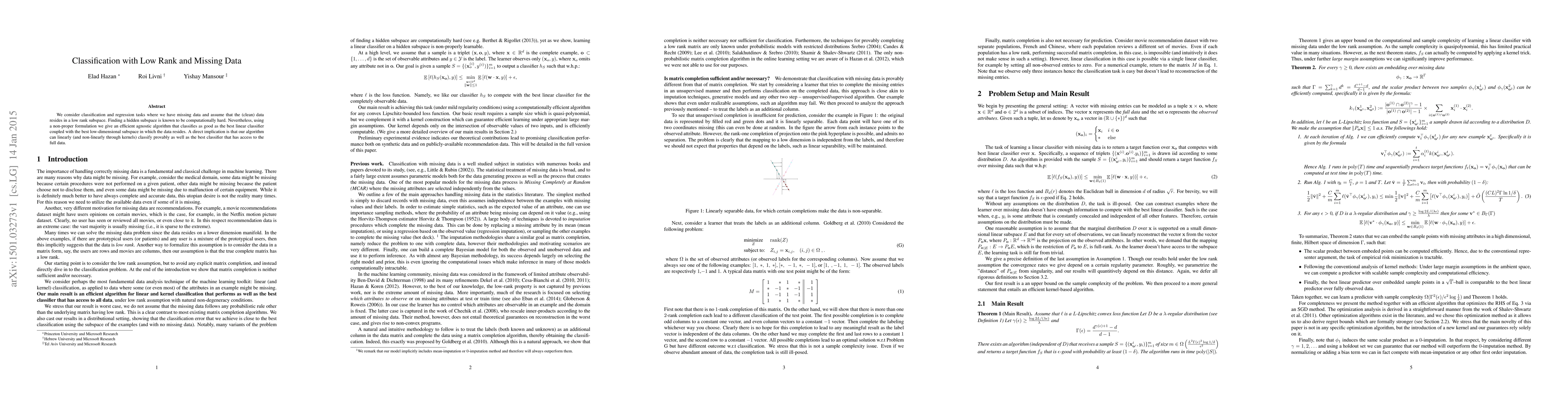 We consider classification and regression tasks where we have missing data and assume that the (clean) data resides in a low rank subspace. Finding a hidden subspace is known to be computationally hard. Nevertheless, using a non-proper formulation we give an efficient agnostic algorithm that classifies as good as the best linear classifier coupled with the best low-dimensional subspace in which the data resides. A direct implication is that our algorithm can linearly (and non-linearly through kernels) classify provably as well as the best classifier that has access to the full data.