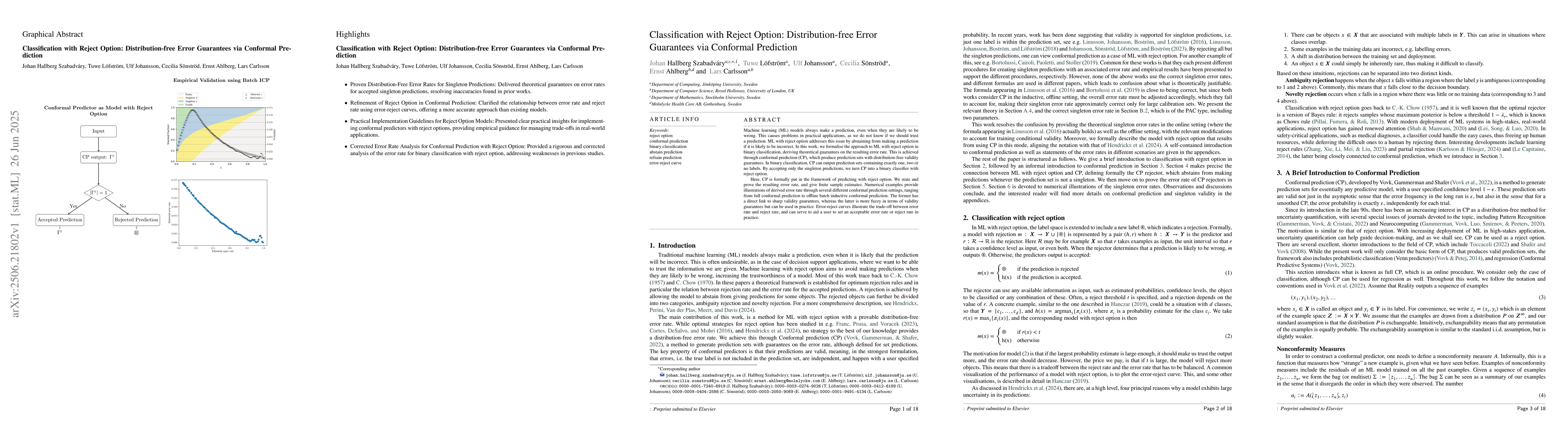 The paper presents a formal framework for machine learning with reject option using conformal prediction, providing distribution-free error guarantees and error-reject curves for practical applications.
