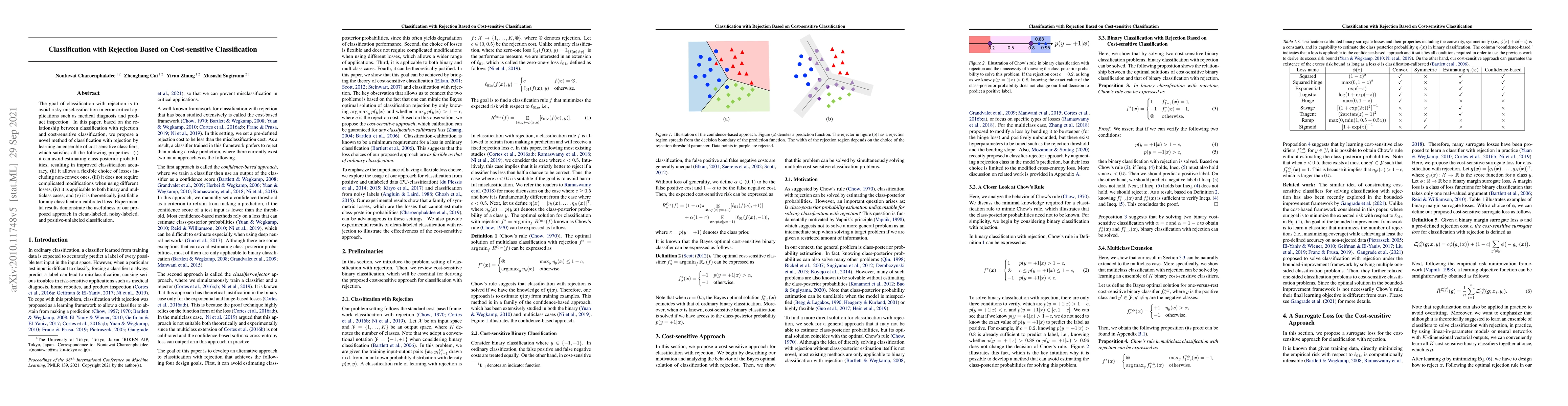 The goal of classification with rejection is to avoid risky misclassification in error-critical applications such as medical diagnosis and product inspection. In this paper, based on the relationship between classification with rejection and cost-sensitive classification, we propose a novel method of classification with rejection by learning an ensemble of cost-sensitive classifiers, which satisfies all the following properties: (i) it can avoid estimating class-posterior probabilities, resulting in improved classification accuracy, (ii) it allows a flexible choice of losses including non-convex ones, (iii) it does not require complicated modifications when using different losses, (iv) it is applicable to both binary and multiclass cases, and (v) it is theoretically justifiable for any classification-calibrated loss. Experimental results demonstrate the usefulness of our proposed approach in clean-labeled, noisy-labeled, and positive-unlabeled classification.