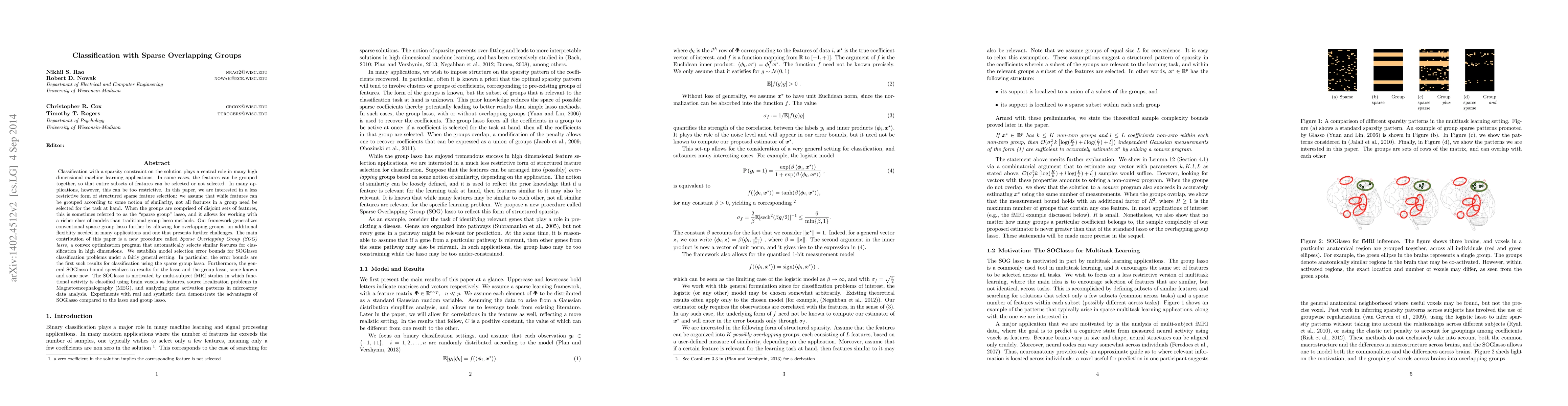 This paper introduces the Sparse Overlapping Group (SOG) lasso method for classification with a sparsity constraint, allowing features to belong to multiple groups. It provides error bounds for the SOGlasso and demonstrates its effectiveness over traditional lasso and group lasso methods through experiments on fMRI, MEG, and gene activation data.
