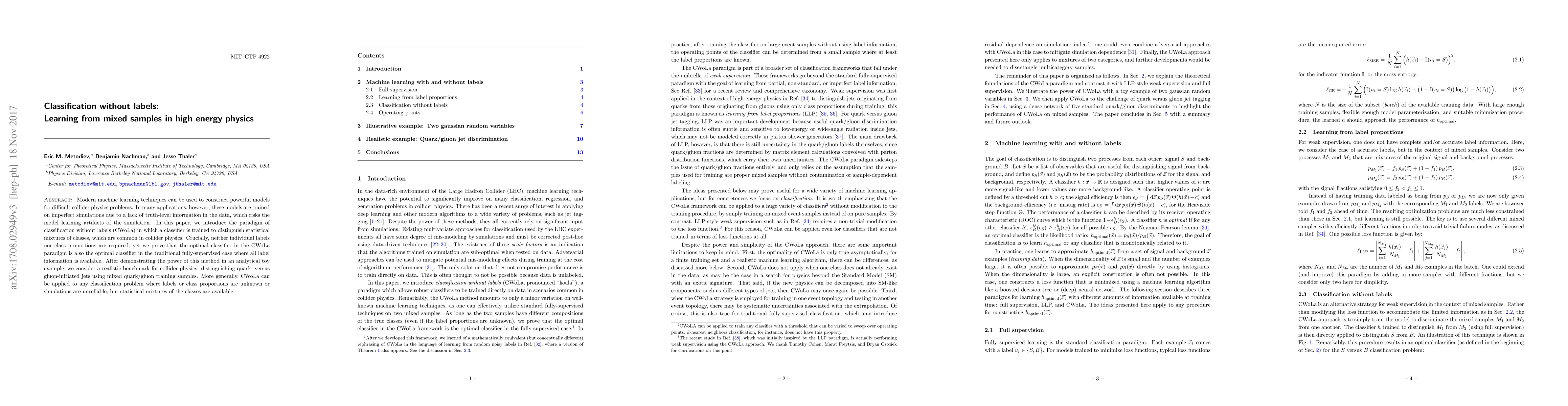Modern machine learning techniques can be used to construct powerful models for difficult collider physics problems. In many applications, however, these models are trained on imperfect simulations due to a lack of truth-level information in the data, which risks the model learning artifacts of the simulation. In this paper, we introduce the paradigm of classification without labels (CWoLa) in which a classifier is trained to distinguish statistical mixtures of classes, which are common in collider physics. Crucially, neither individual labels nor class proportions are required, yet we prove that the optimal classifier in the CWoLa paradigm is also the optimal classifier in the traditional fully-supervised case where all label information is available. After demonstrating the power of this method in an analytical toy example, we consider a realistic benchmark for collider physics: distinguishing quark- versus gluon-initiated jets using mixed quark/gluon training samples. More generally, CWoLa can be applied to any classification problem where labels or class proportions are unknown or simulations are unreliable, but statistical mixtures of the classes are available.