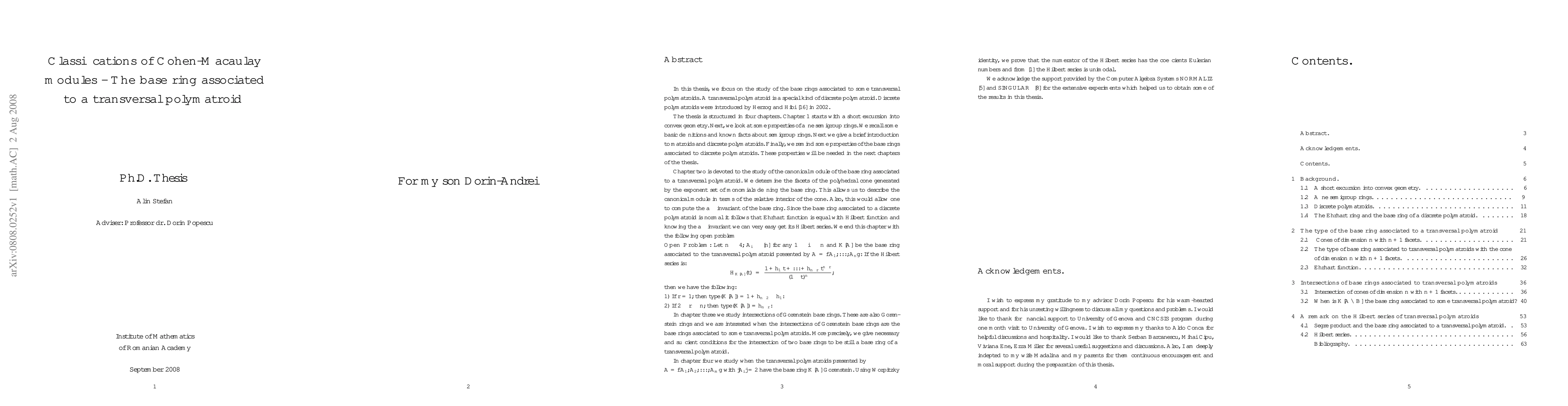 Summary: This thesis investigates base rings linked to transversal polymatroids, a specific type of discrete polymatroid introduced by Herzog and Hibi in 2002, focusing on their Cohen-Macaulay module classifications.