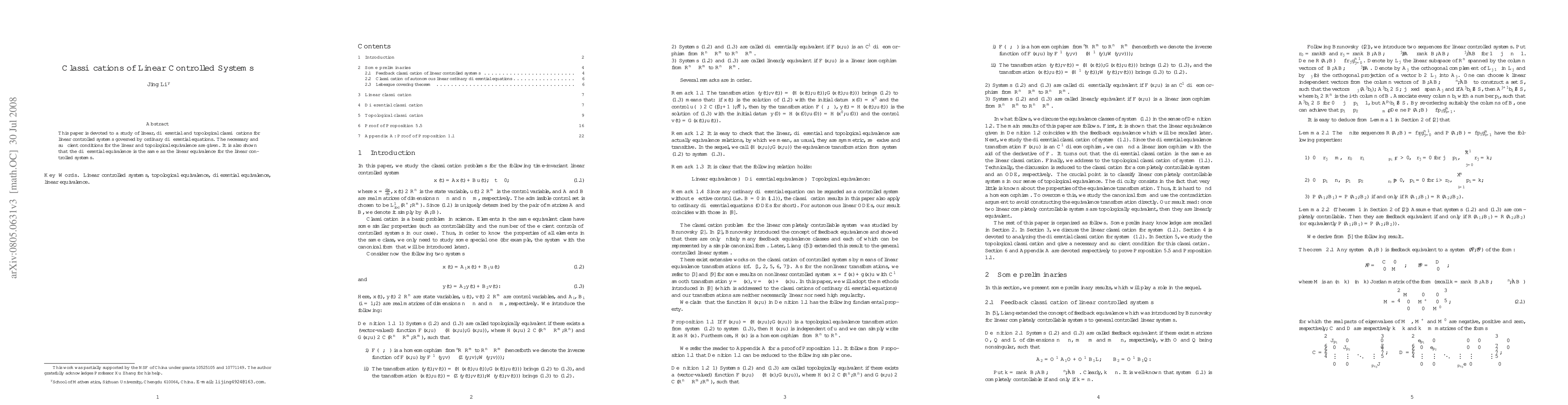 This paper explores classifications of linear controlled systems through linear, differential, and topological perspectives, providing necessary and sufficient conditions for linear and topological equivalence, and demonstrating that differential equivalence coincides with linear equivalence for these systems.