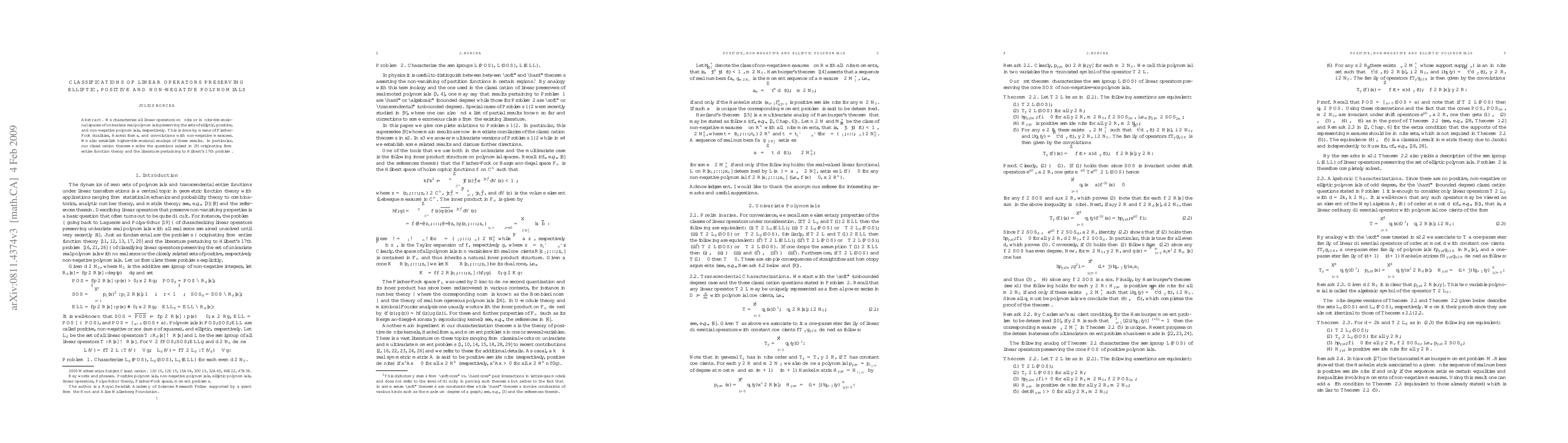 This paper classifies linear operators that preserve elliptic, positive, and non-negative polynomials using Fischer-Fock dualities, Hankel forms, and convolutions with non-negative measures. It also extends these results to higher dimensions, addressing questions from entire function theory and Hilbert's 17th problem.