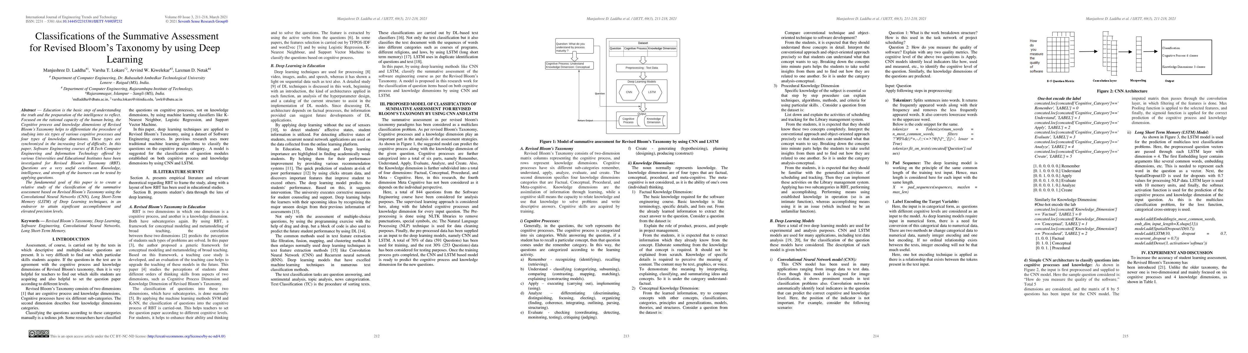 Education is the basic step of understanding the truth and the preparation of the intelligence to reflect. Focused on the rational capacity of the human being the Cognitive process and knowledge dimensions of Revised Blooms Taxonomy helps to differentiate the procedure of studying into six types of various cognitive processes and four types of knowledge dimensions. These types are synchronized in the increasing level of difficulty. In this paper Software Engineering courses of B.Tech Computer Engineering and Information Technology offered by various Universities and Educational Institutes have been investigated for Revised Blooms Taxonomy RBT. Questions are a very useful constituent. Knowledge intelligence and strength of the learners can be tested by applying questions.The fundamental goal of this paper is to create a relative study of the classification of the summative assessment based on Revised Blooms Taxonomy using the Convolutional Neural Networks CNN Long Short-Term Memory LSTM of Deep Learning techniques in an endeavor to attain significant accomplishment and elevated precision levels.