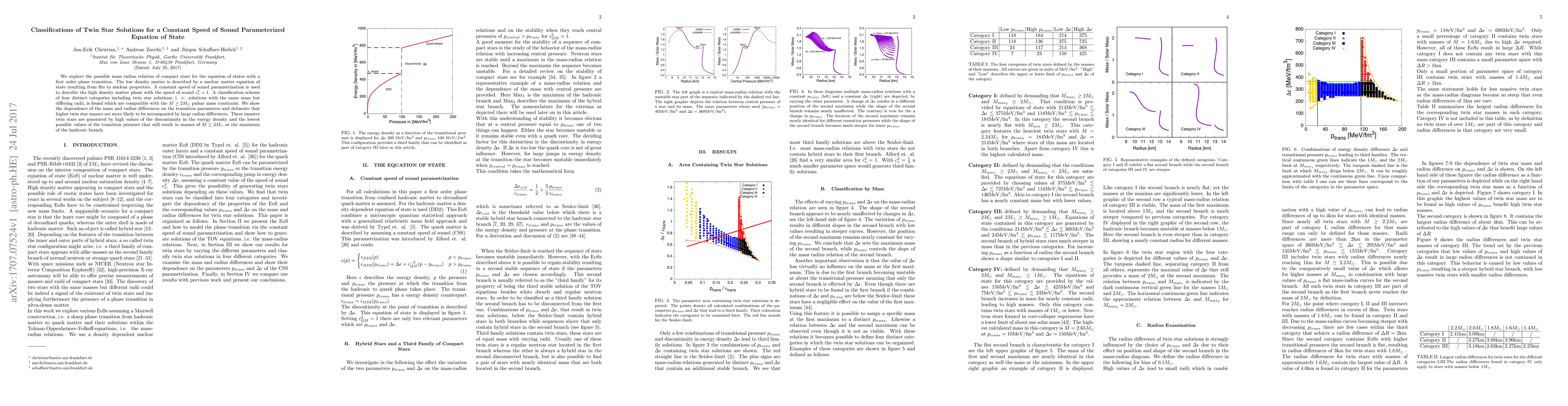 This research classifies compact star mass-radius relationships using a first-order phase transition model with constant speed of sound. It identifies four categories, including 'twin stars' with the same mass but different radii, compatible with $M ge 2M_odot$ pulsar mass constraint. Higher twin star masses correlate with larger radius differences, generated by high energy density discontinuity and low transition pressure.