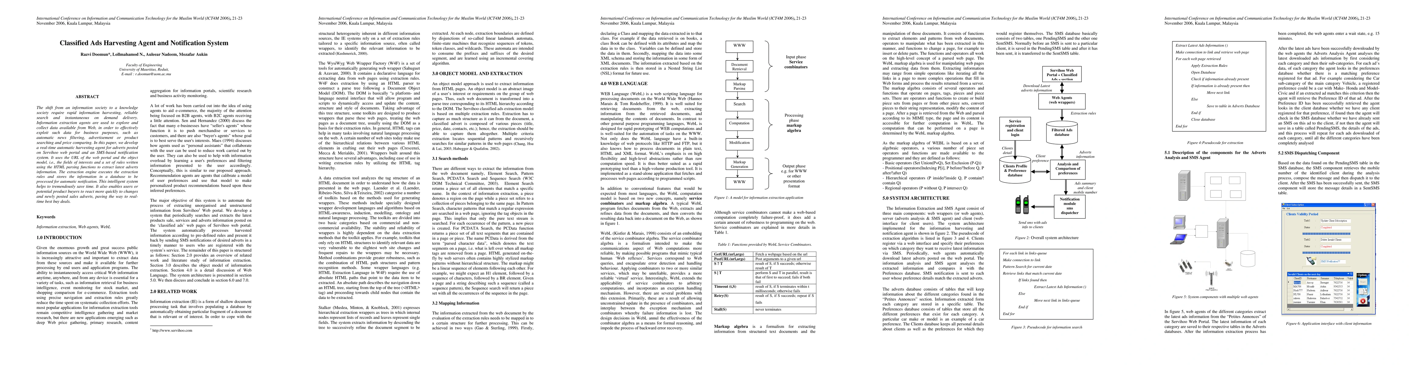 This paper develops a real-time harvesting agent for extracting classified ads from the Servihoo web portal and an SMS-based notification system to deliver updates instantly. The system uses URL and object model rules to extract and store data, facilitating rapid response to new sales adverts.