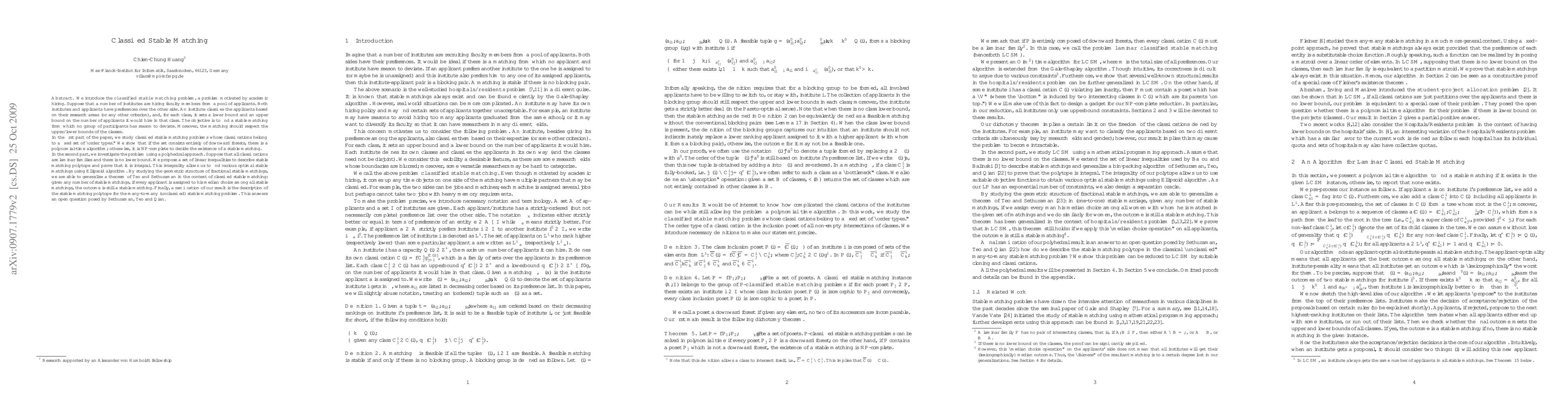 This paper introduces the classified stable matching problem, motivated by academic hiring scenarios, where institutes classify applicants and set hiring bounds per class. It presents a polynomial-time algorithm for a specific set of classifications and uses a polyhedral approach to describe and solve the stable matching polytope, proving its integrality.