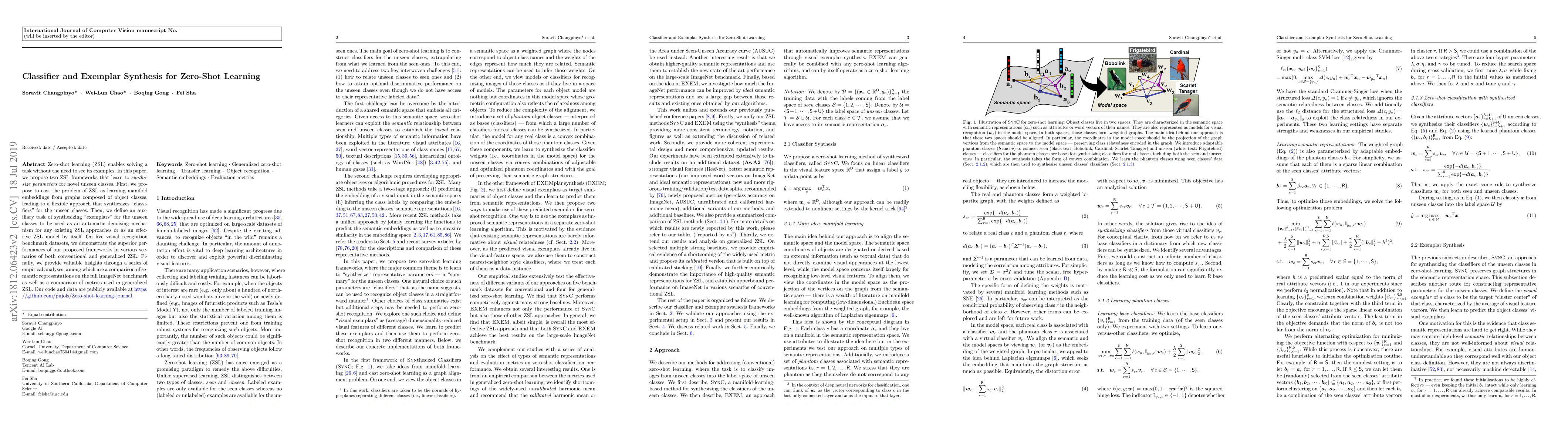 This paper proposes two frameworks for zero-shot learning that synthesize classifiers and exemplars for novel unseen classes, outperforming existing approaches on five visual recognition benchmark datasets.
