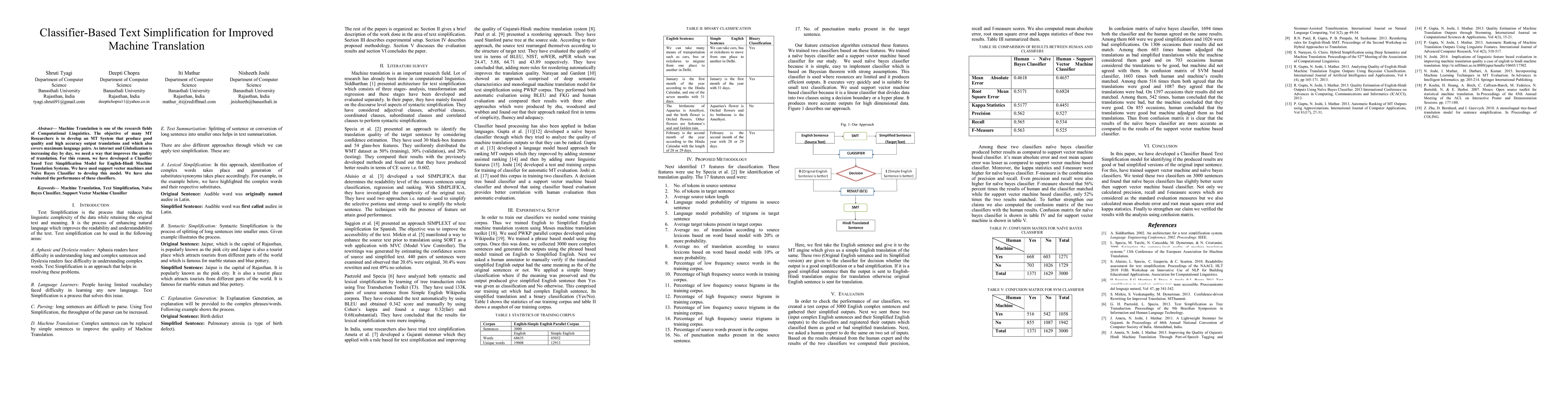 Machine Translation is one of the research fields of Computational Linguistics. The objective of many MT Researchers is to develop an MT System that produce good quality and high accuracy output translations and which also covers maximum language pairs. As internet and Globalization is increasing day by day, we need a way that improves the quality of translation. For this reason, we have developed a Classifier based Text Simplification Model for English-Hindi Machine Translation Systems. We have used support vector machines and Na\"ive Bayes Classifier to develop this model. We have also evaluated the performance of these classifiers.