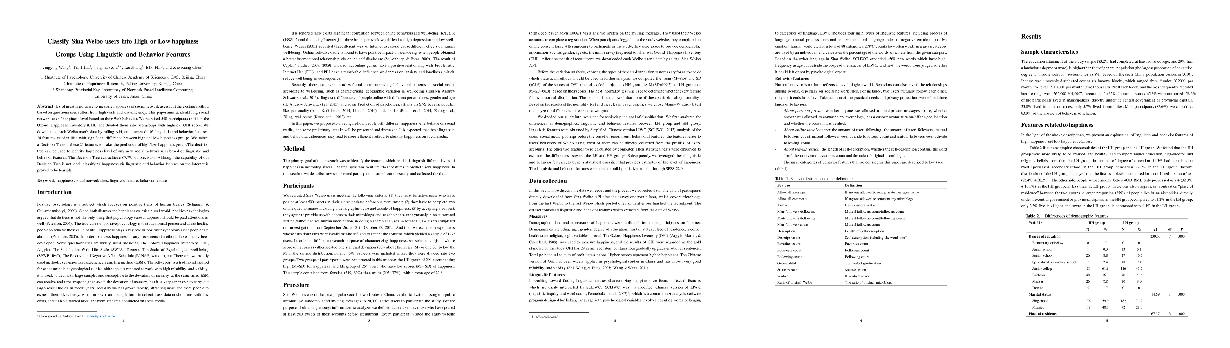 This paper proposes a method to classify Sina Weibo users into high or low happiness groups using linguistic and behavior features extracted from their online activity. The study identifies 24 significant features from 103 extracted, trains a Decision Tree model, and achieves a precision of 67.7%, demonstrating the feasibility of happiness classification via online behavior.