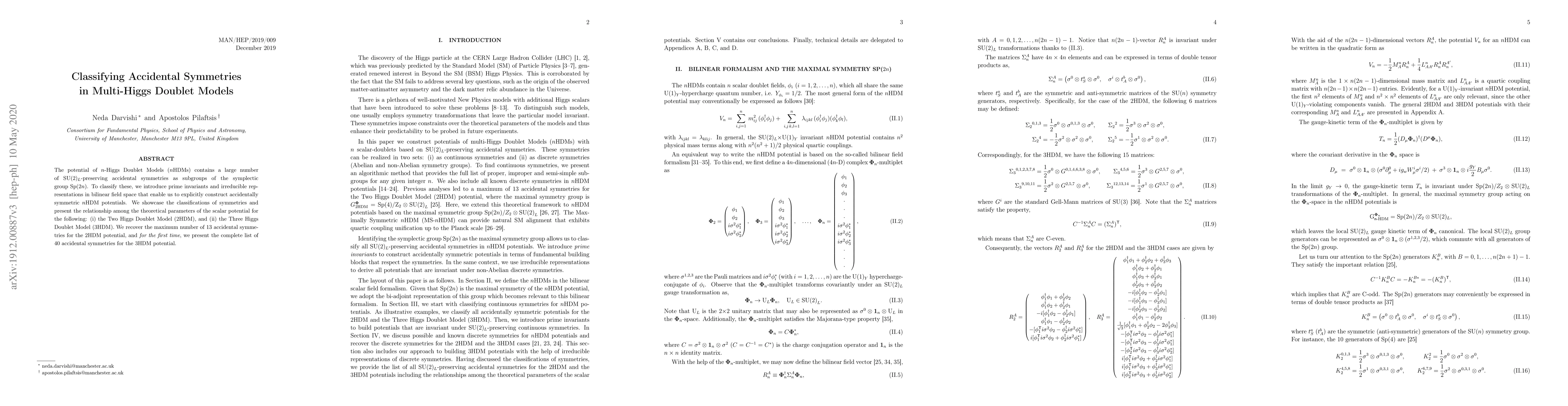 This paper classifies accidental symmetries in $n$-Higgs Doublet Models by introducing prime invariants and irreducible representations, specifically recovering 13 symmetries for the 2HDM and presenting a complete list of 40 symmetries for the 3HDM.