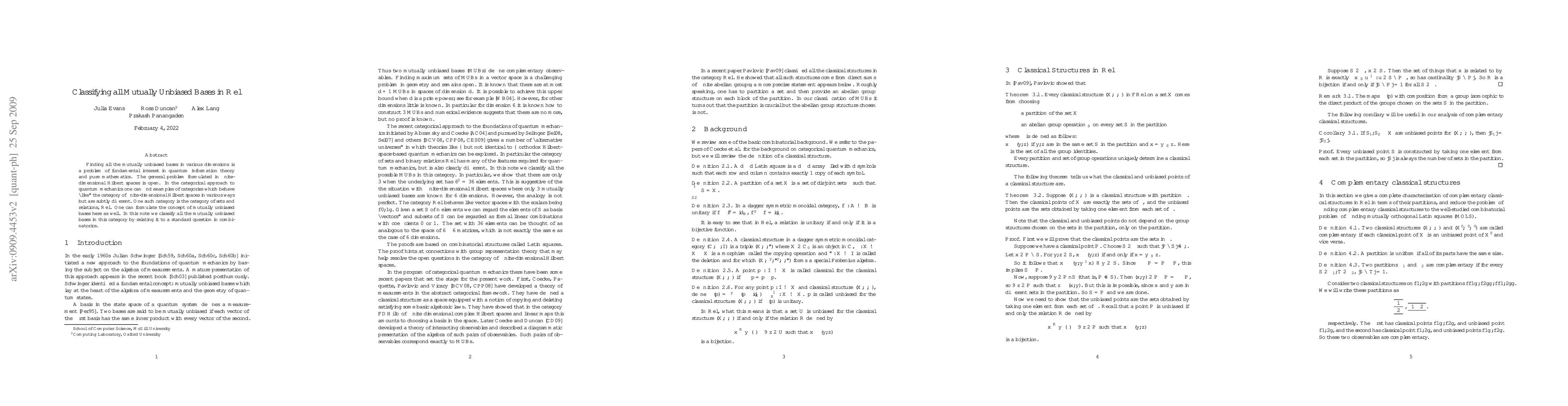 Researchers classified all mutually unbiased bases in the category Rel, a fundamental concept in quantum information theory, and found that they can be related to a standard question in combinatorics.