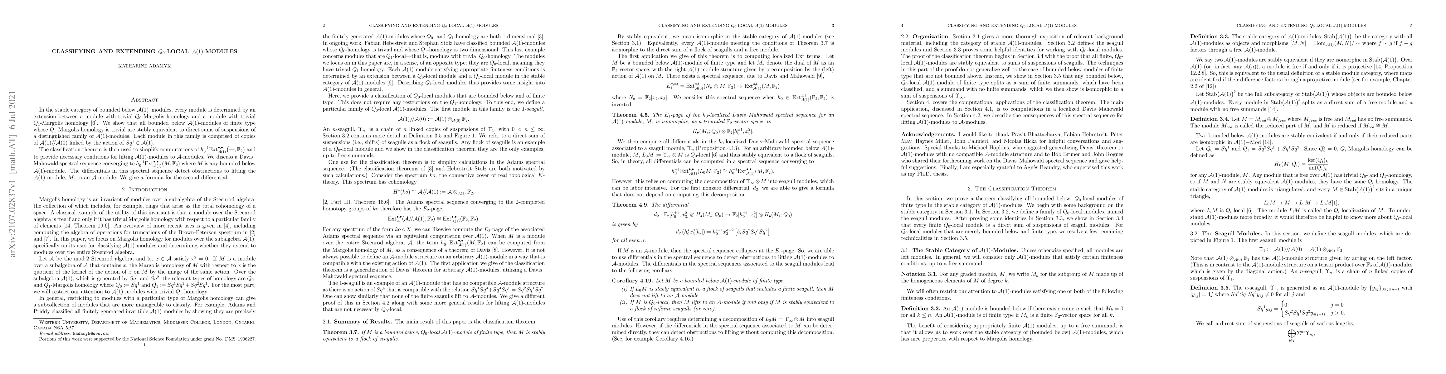 This paper classifies and extends $Q_0$-local $\mathcal{A}(1)$-modules in the stable category, showing that certain modules are stably equivalent to suspensions of a distinguished family. It also simplifies computations of certain Ext groups and provides conditions for lifting $\mathcal{A}(1)$-modules to $\mathcal{A}$-modules, using a Davis--Mahowald spectral sequence to detect lifting obstructions.