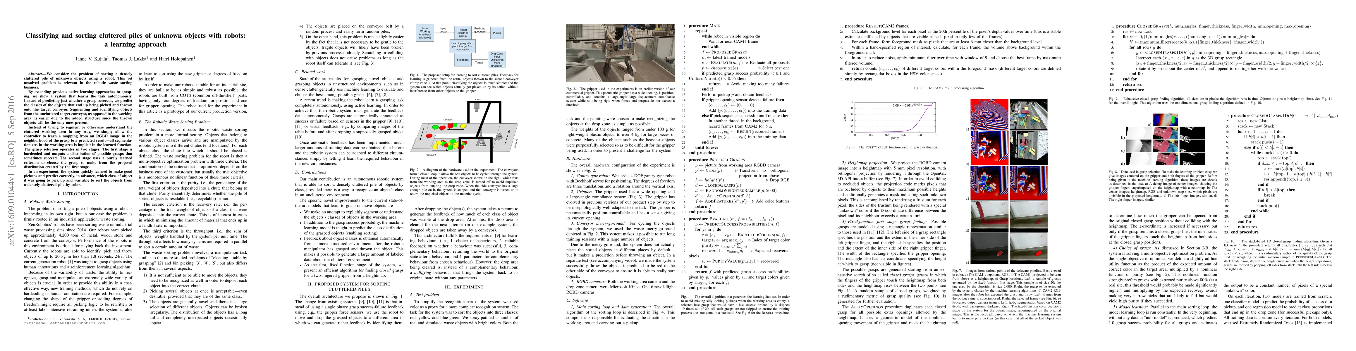 This paper presents a robot system that autonomously learns to classify and sort unknown objects from densely cluttered piles, focusing on predicting object classes rather than grasping success. The robot uses a two-stage grasp selection process and learns a mapping from RGBD images to grasp outcomes, achieving effective sorting by color.