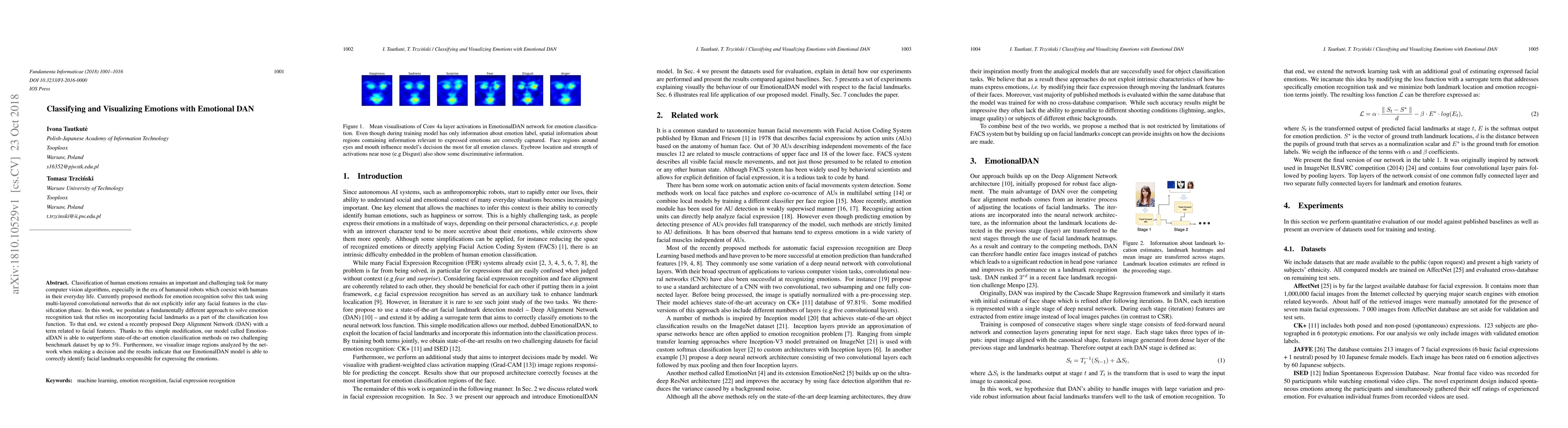 Classification of human emotions remains an important and challenging task for many computer vision algorithms, especially in the era of humanoid robots which coexist with humans in their everyday life. Currently proposed methods for emotion recognition solve this task using multi-layered convolutional networks that do not explicitly infer any facial features in the classification phase. In this work, we postulate a fundamentally different approach to solve emotion recognition task that relies on incorporating facial landmarks as a part of the classification loss function. To that end, we extend a recently proposed Deep Alignment Network (DAN) with a term related to facial features. Thanks to this simple modification, our model called EmotionalDAN is able to outperform state-of-the-art emotion classification methods on two challenging benchmark dataset by up to 5%. Furthermore, we visualize image regions analyzed by the network when making a decision and the results indicate that our EmotionalDAN model is able to correctly identify facial landmarks responsible for expressing the emotions.