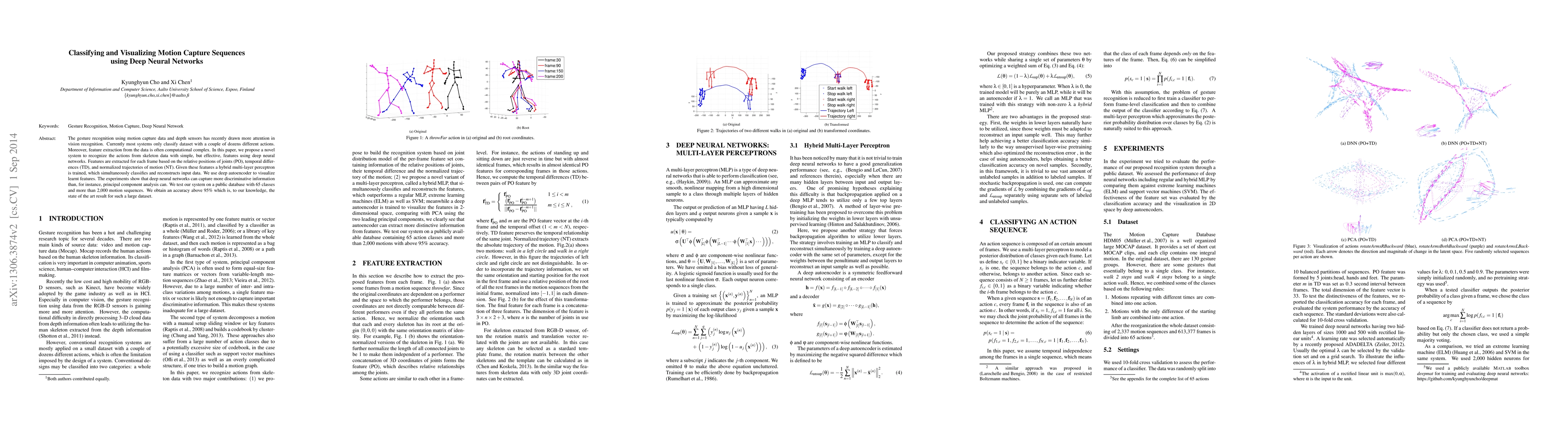 This paper proposes a deep neural network system for classifying and visualizing motion capture sequences, utilizing features from joint positions, temporal differences, and normalized trajectories. The hybrid multi-layer perceptron achieves an accuracy of over 95% on a dataset with 65 classes, demonstrating superior discriminative feature capture compared to PCA.