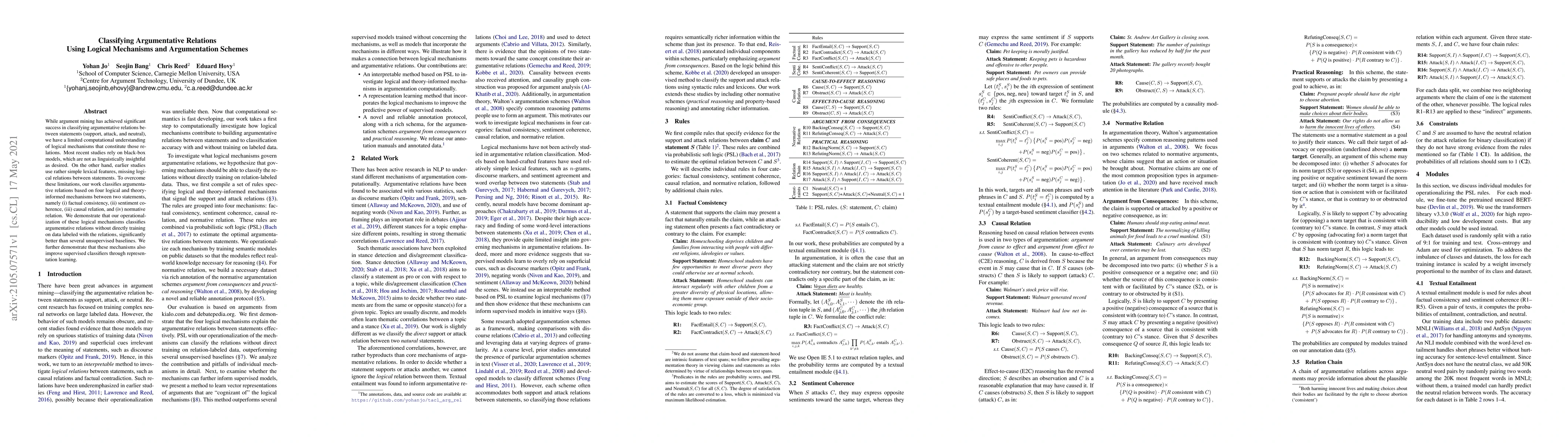 While argument mining has achieved significant success in classifying argumentative relations between statements (support, attack, and neutral), we have a limited computational understanding of logical mechanisms that constitute those relations. Most recent studies rely on black-box models, which are not as linguistically insightful as desired. On the other hand, earlier studies use rather simple lexical features, missing logical relations between statements. To overcome these limitations, our work classifies argumentative relations based on four logical and theory-informed mechanisms between two statements, namely (i) factual consistency, (ii) sentiment coherence, (iii) causal relation, and (iv) normative relation. We demonstrate that our operationalization of these logical mechanisms classifies argumentative relations without directly training on data labeled with the relations, significantly better than several unsupervised baselines. We further demonstrate that these mechanisms also improve supervised classifiers through representation learning.