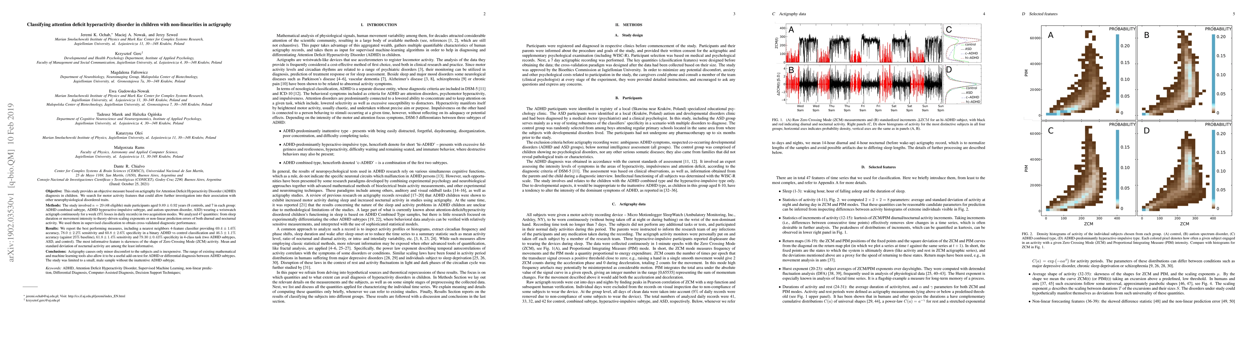 This study uses actigraphy to objectively classify ADHD in children, identifying motor activity features for diagnosis. A 4-feature classifier achieved 69.4% accuracy in distinguishing ADHD from controls, highlighting the skewness of Zero Crossing Mode activity as the most informative feature.