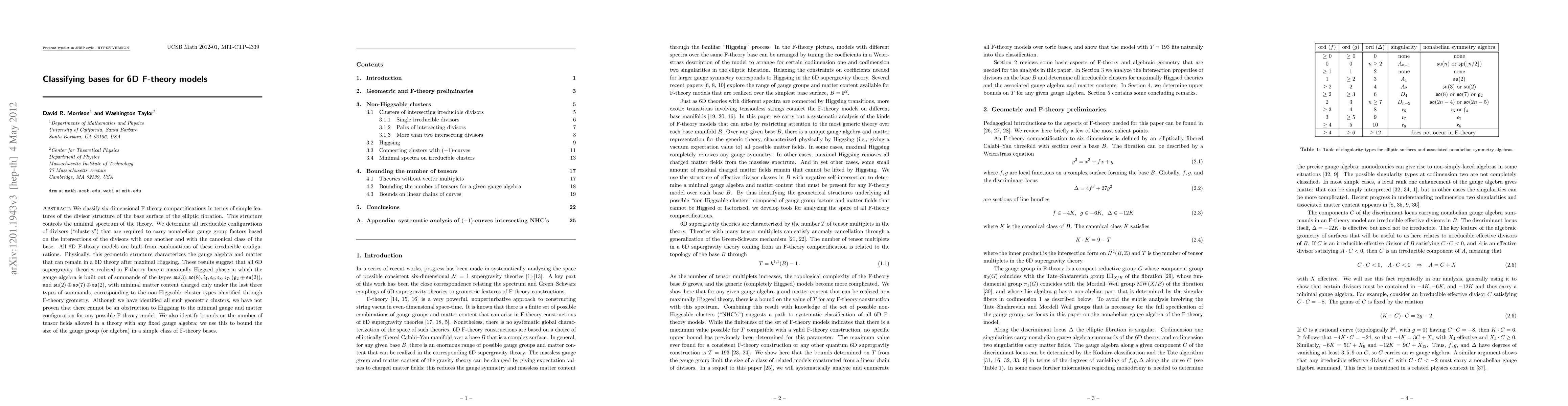 The research classifies six-dimensional F-theory models based on the divisor structure of the base surface of the elliptic fibration, determining all irreducible configurations of divisors ('clusters') required for nonabelian gauge group factors.