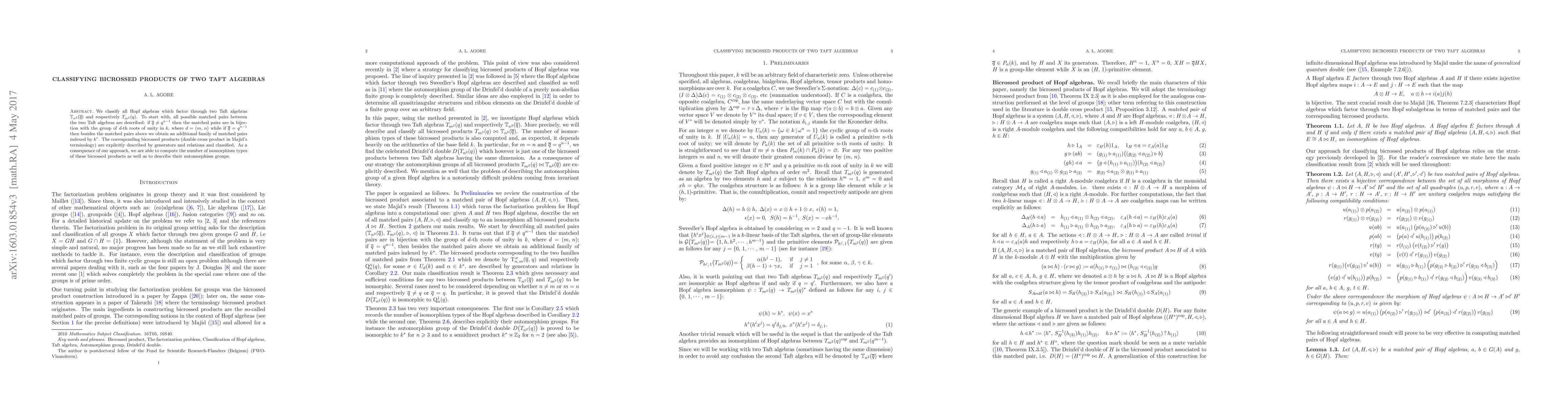This paper classifies Hopf algebras that factorize through two Taft algebras $\mathbb{T}_{n^{2}}(\bar{q})$ and $T_{m^{2}}(q)$, describing matched pairs and bicrossed products with specific conditions on $\bar{q}$ and $q$. It also computes the number of isomorphism types and describes their automorphism groups.