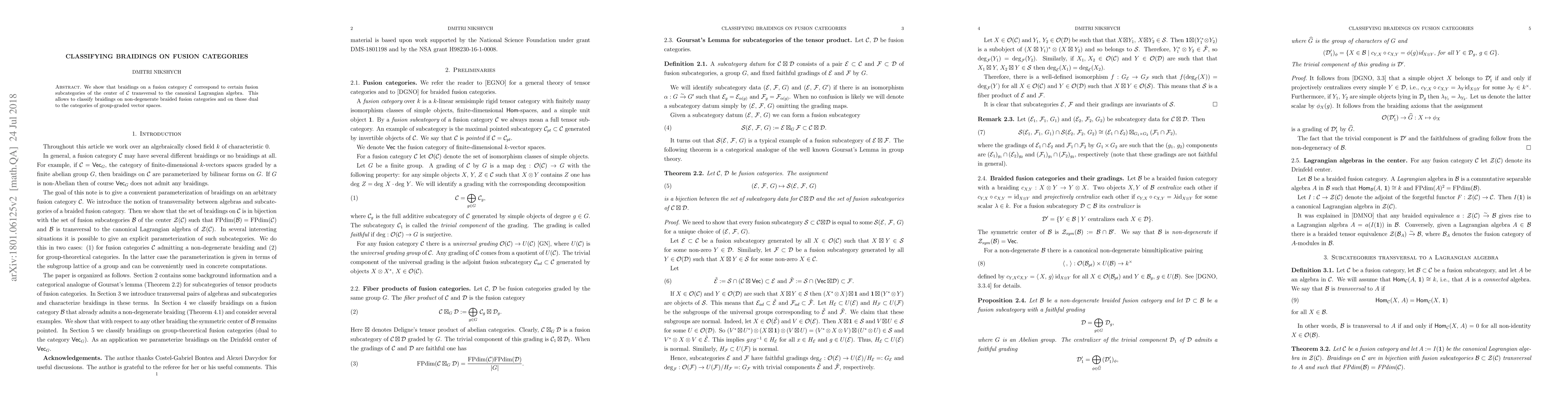 We show that braidings on a fusion category $\mathcal{C}$ correspond to certain fusion subcategories of the center of $\mathcal{C}$ transversal to the canonical Lagrangian algebra. This allows to classify braidings on non-degenerate and group-theoretical fusion categories.