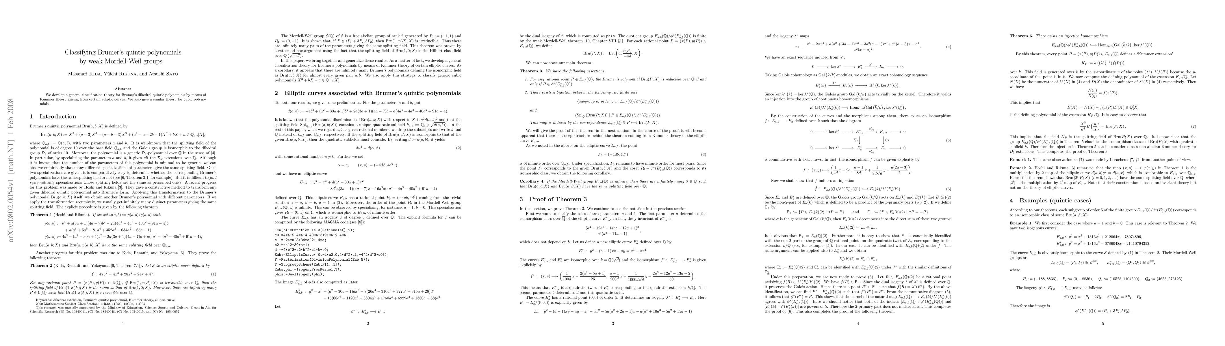 This paper develops a classification theory for Brumer's dihedral quintic polynomials and cubic polynomials using Kummer theory in relation to specific elliptic curves, leveraging the structure of their weak Mordell-Weil groups. The approach utilizes advanced algebraic methods to categorize these polynomials.