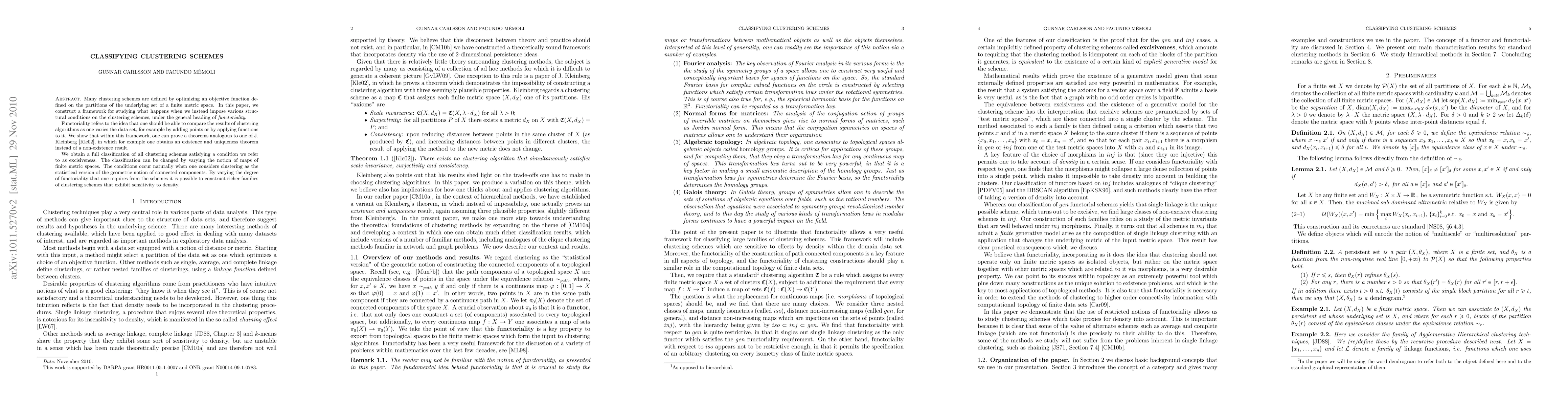 Many clustering schemes are defined by optimizing an objective function defined on the partitions of the underlying set of a finite metric space. In this paper, we construct a framework for studying what happens when we instead impose various structural conditions on the clustering schemes, under the general heading of functoriality. Functoriality refers to the idea that one should be able to compare the results of clustering algorithms as one varies the data set, for example by adding points or by applying functions to it. We show that within this framework, one can prove a theorems analogous to one of J. Kleinberg, in which for example one obtains an existence and uniqueness theorem instead of a non-existence result. We obtain a full classification of all clustering schemes satisfying a condition we refer to as excisiveness. The classification can be changed by varying the notion of maps of finite metric spaces. The conditions occur naturally when one considers clustering as the statistical version of the geometric notion of connected components. By varying the degree of functoriality that one requires from the schemes it is possible to construct richer families of clustering schemes that exhibit sensitivity to density.