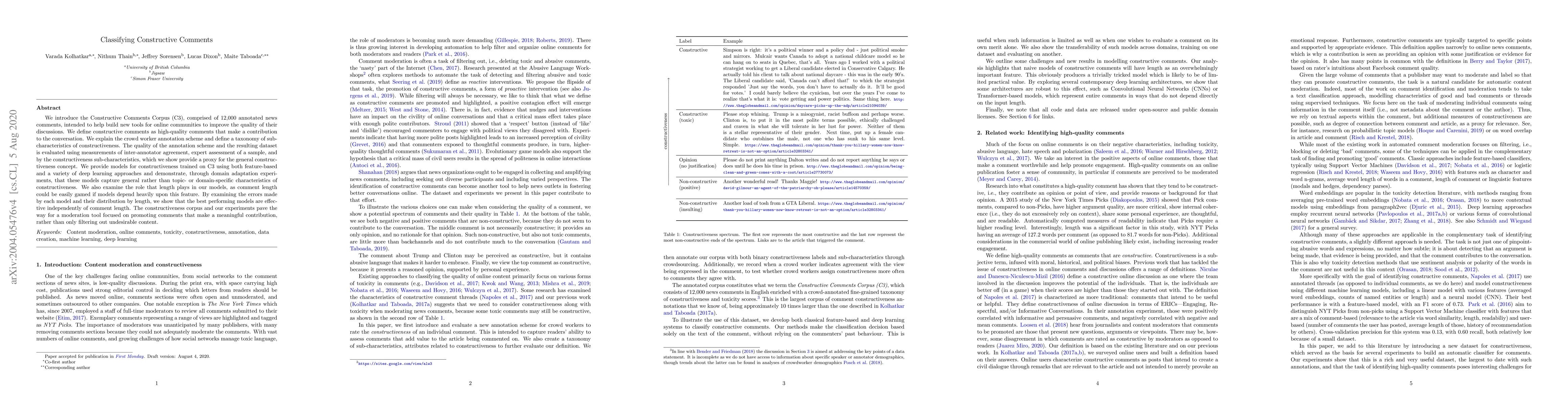 The paper introduces the Constructive Comments Corpus (C3) to aid in developing tools for enhancing online discussions, defining constructive comments as high-quality contributions. It evaluates the annotation scheme and demonstrates that models trained on C3 capture general constructiveness characteristics, showing less correlation with comment length, thus paving the way for moderation tools that promote valuable contributions.
