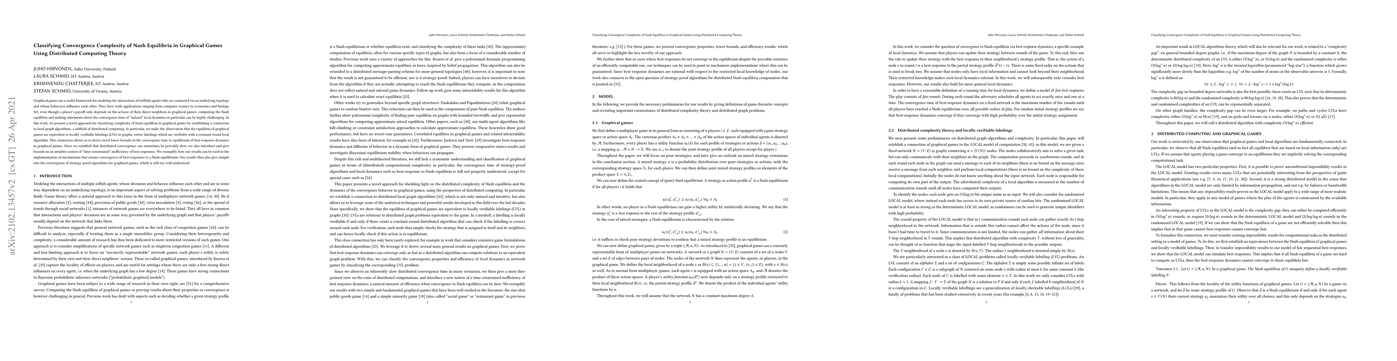 This paper classifies the complexity of Nash equilibria in graphical games by linking them to locally verifiable labelings in distributed computing, providing lower bounds on convergence time and introducing a measure of "time-constrained" inefficiency. The findings offer insights into the convergence of strategy-proof algorithms for these games.