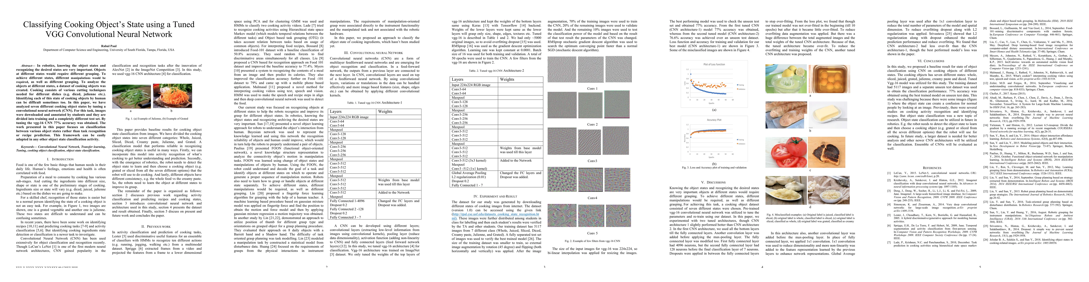 This paper presents a tuned VGG-16 convolutional neural network for classifying seven different states of cooking objects, achieving 77% accuracy. The focus is on state classification rather than task recognition, with the potential for broader application in object state identification.