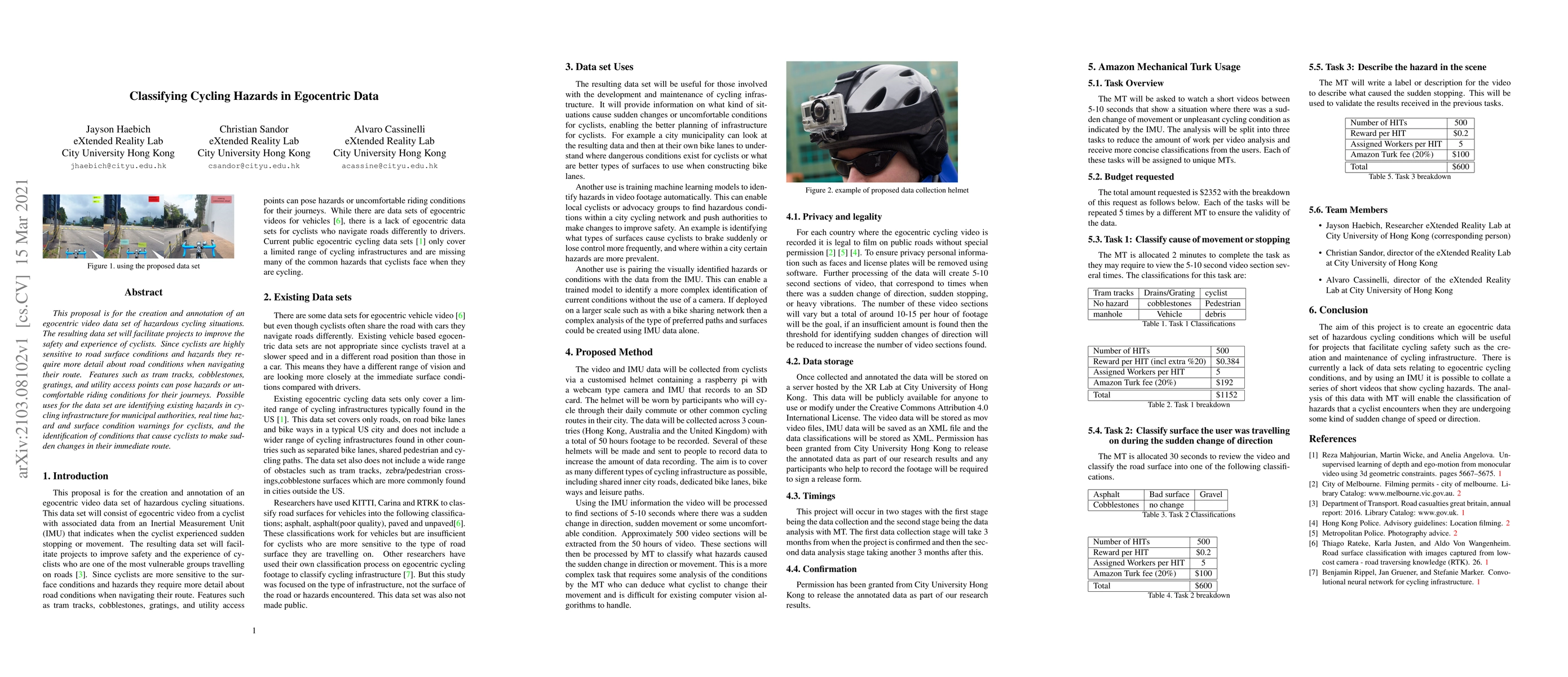 This research proposes creating a detailed egocentric video dataset of hazardous cycling situations to improve cyclist safety and experience. The dataset will help identify infrastructure hazards, provide real-time warnings, and analyze route changes by cyclists.