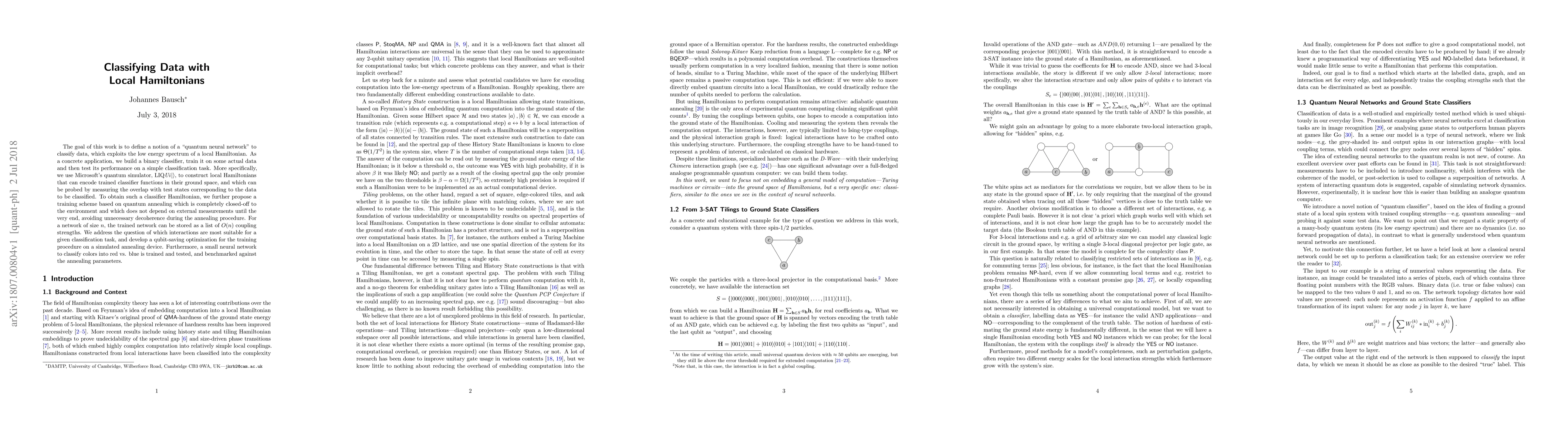 The goal of this work is to define a notion of a quantum neural network to classify data, which exploits the low energy spectrum of a local Hamiltonian. As a concrete application, we build a binary classifier, train it on some actual data and then test its performance on a simple classification task. More specifically, we use Microsoft's quantum simulator, Liquid, to construct local Hamiltonians that can encode trained classifier functions in their ground space, and which can be probed by measuring the overlap with test states corresponding to the data to be classified. To obtain such a classifier Hamiltonian, we further propose a training scheme based on quantum annealing which is completely closed-off to the environment and which does not depend on external measurements until the very end, avoiding unnecessary decoherence during the annealing procedure. For a network of size n, the trained network can be stored as a list of O(n) coupling strengths. We address the question of which interactions are most suitable for a given classification task, and develop a qubit-saving optimization for the training procedure on a simulated annealing device. Furthermore, a small neural network to classify colors into red vs. blue is trained and tested, and benchmarked against the annealing parameters.