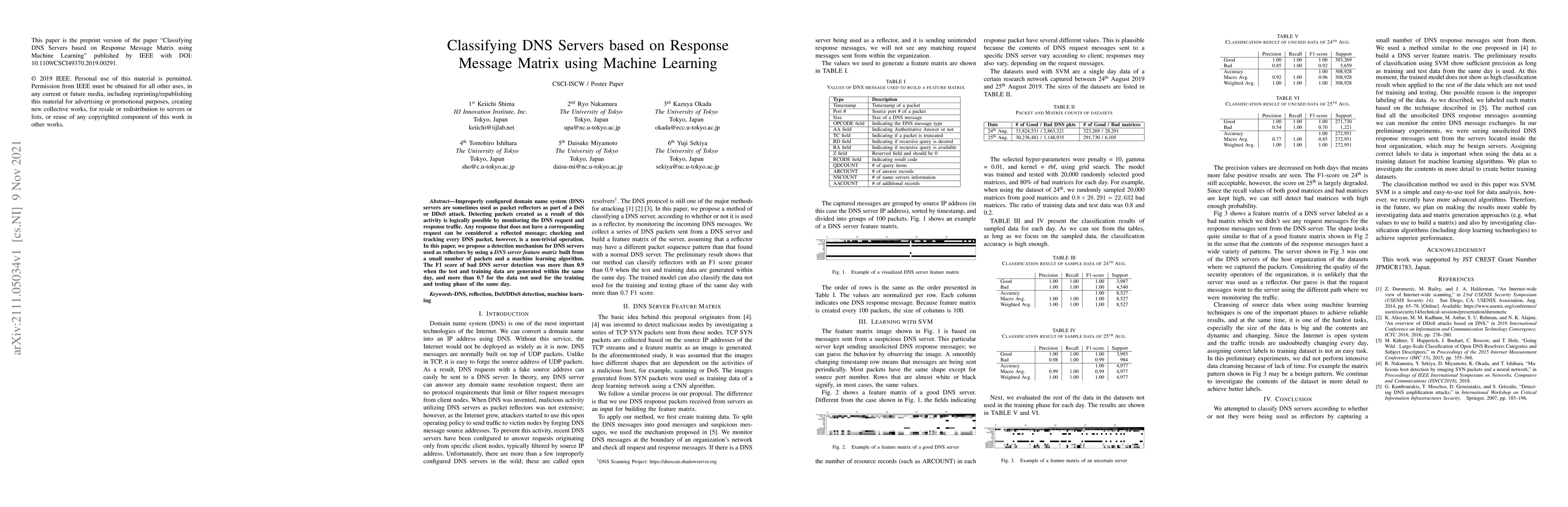 This paper proposes a machine learning method to classify DNS servers based on a response message matrix derived from a small number of packets, aiming to detect improperly configured DNS servers used in DDoS attacks. The method achieved an F1 score over 0.9 for detecting bad DNS servers when using same-day data, and over 0.7 for data not used in training.