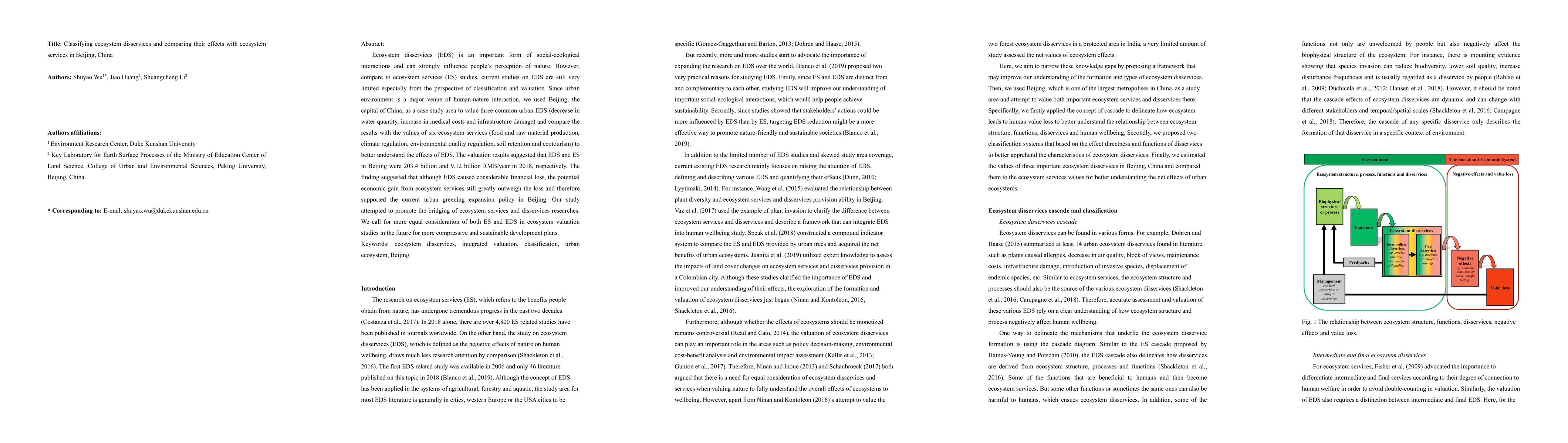 This study classifies and compares ecosystem disservices (EDS) with ecosystem services (ES) in Beijing, China, using a functional classification system. The findings indicate that while EDS cause significant financial losses, the economic benefits from ES still outweigh these losses, highlighting the importance of considering EDS in sustainable urban development policies.