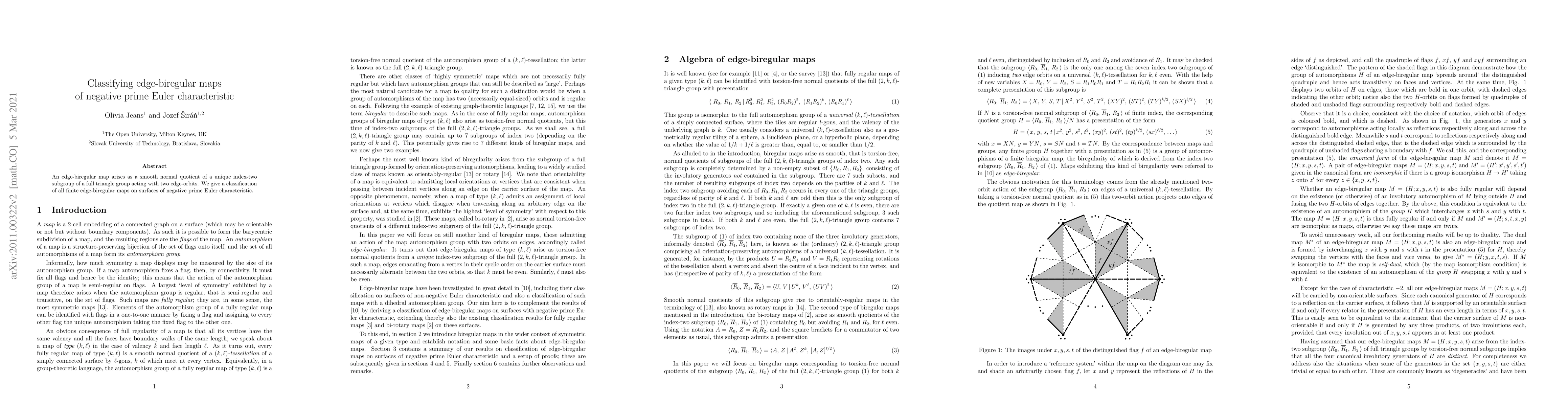 An edge-biregular map arises as a smooth normal quotient of a unique index-two subgroup of a full triangle group acting with two edge-orbits. We give a classification of all finite edge-biregular maps on surfaces of negative prime Euler characteristic.
