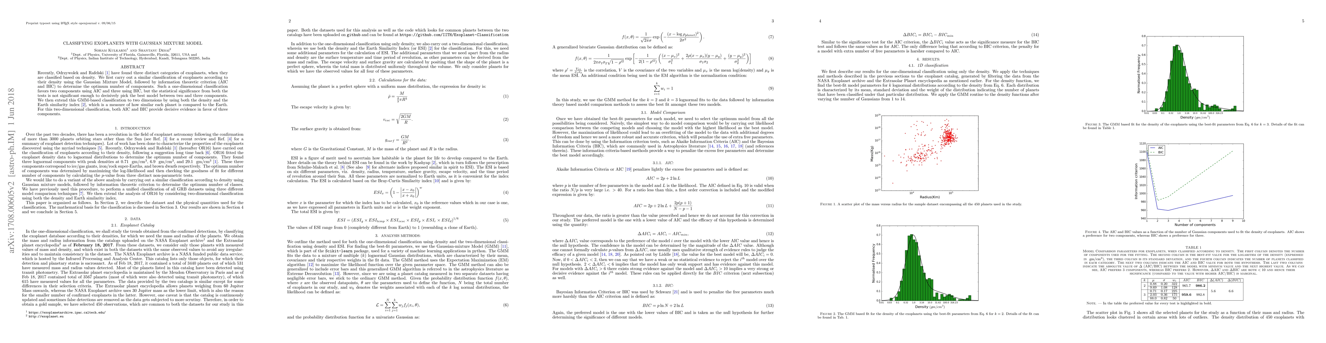 Recently, Odrzywolek and Rafelski (arXiv:1612.03556) have found three distinct categories of exoplanets, when they are classified based on density. We first carry out a similar classification of exoplanets according to their density using the Gaussian Mixture Model, followed by information theoretic criterion (AIC and BIC) to determine the optimum number of components. Such a one-dimensional classification favors two components using AIC and three using BIC, but the statistical significance from both the tests is not significant enough to decisively pick the best model between two and three components. We then extend this GMM-based classification to two dimensions by using both the density and the Earth similarity index (arXiv:1702.03678), which is a measure of how similar each planet is compared to the Earth. For this two-dimensional classification, both AIC and BIC provide decisive evidence in favor of three components.