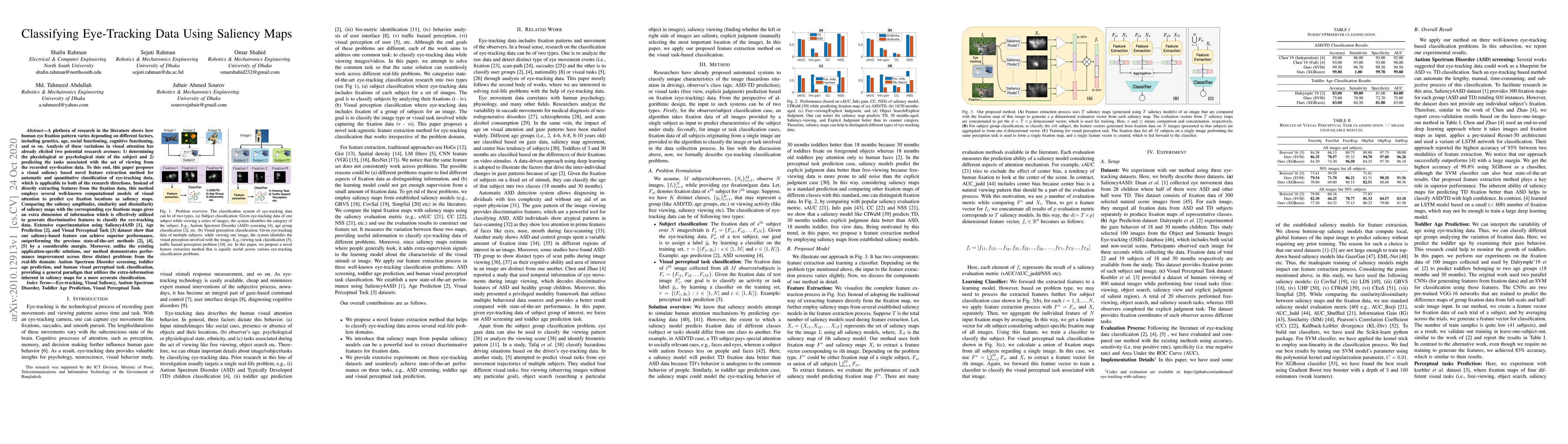 This paper proposes a novel saliency-based feature extraction method for classifying eye-tracking data, utilizing saliency maps to predict fixation locations and generate discriminative features. The method outperforms previous state-of-the-art techniques and demonstrates superior performance across Autism Spectrum Disorder screening, age prediction, and visual perceptual task classification.
