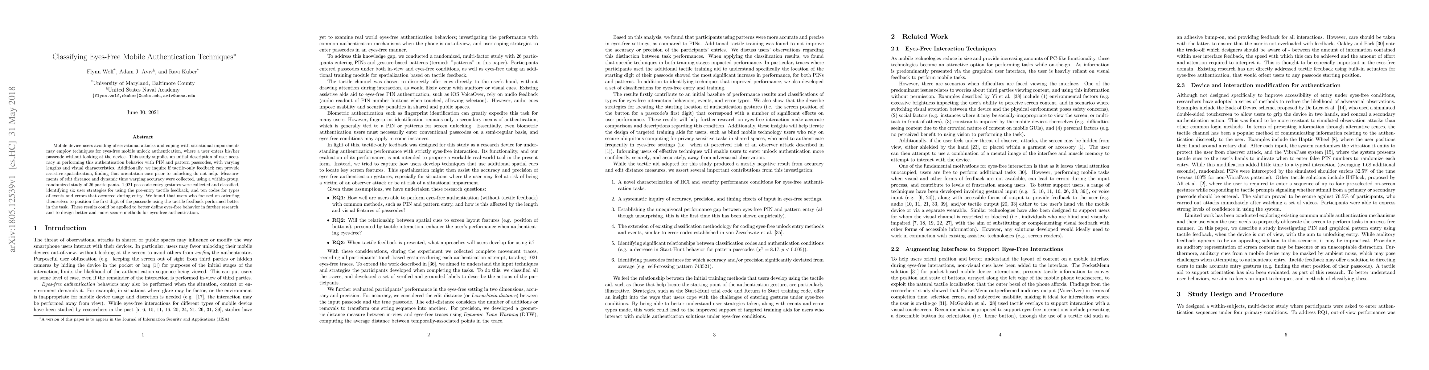 This study investigates the accuracy of eyes-free mobile authentication using PIN and pattern passcodes, identifying six user strategies and ten types of errors. Results show that users who utilize tactile feedback to orient themselves perform better, suggesting potential improvements in eyes-free authentication methods.