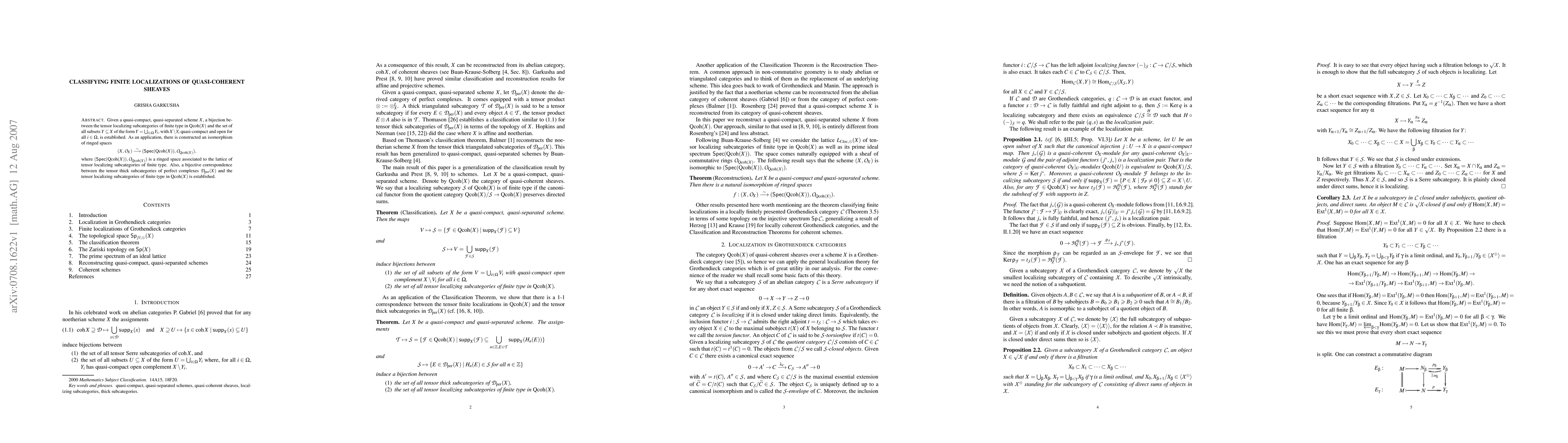 Given a quasi-compact, quasi-separated scheme X, a bijection between the tensor localizing subcategories of finite type in Qcoh(X) and the set of all subsets $Y\subseteq X$ of the form $Y=\bigcup_{i\in\Omega}Y_i$, with $X\setminus Y_i$ quasi-compact and open for all $i\in\Omega$, is established. As an application, there is constructed an isomorphism of ringed spaces (X,O_X)-->(Spec(Qcoh(X)),O_{Qcoh(X)}), where $(Spec(Qcoh(X)),O_{Qcoh(X)})$ is a ringed space associated to the lattice of tensor localizing subcategories of finite type. Also, a bijective correspondence between the tensor thick subcategories of perfect complexes $\perf(X)$ and the tensor localizing subcategories of finite type in Qcoh(X) is established.