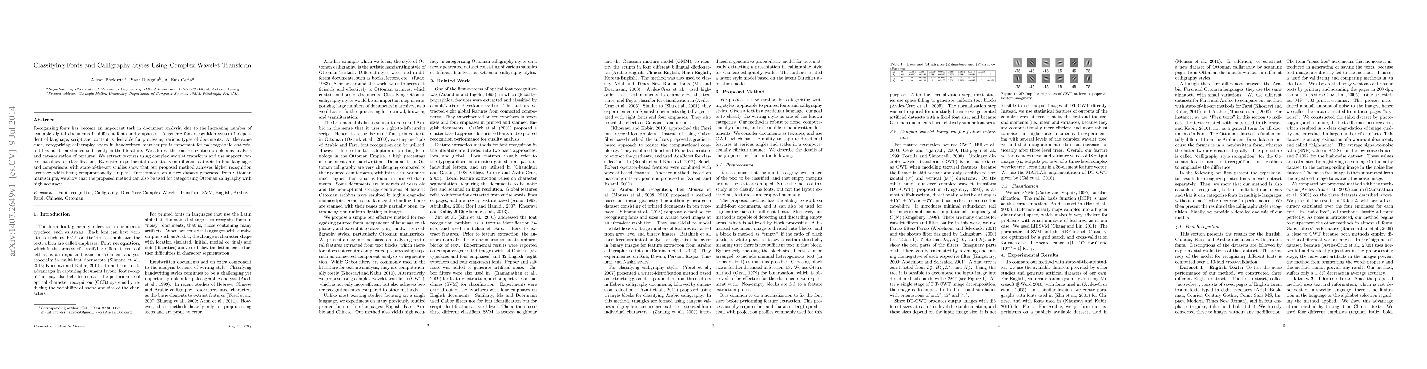 Recognizing fonts has become an important task in document analysis, due to the increasing number of available digital documents in different fonts and emphases. A generic font-recognition system independent of language, script and content is desirable for processing various types of documents. At the same time, categorizing calligraphy styles in handwritten manuscripts is important for palaeographic analysis, but has not been studied sufficiently in the literature. We address the font-recognition problem as analysis and categorization of textures. We extract features using complex wavelet transform and use support vector machines for classification. Extensive experimental evaluations on different datasets in four languages and comparisons with state-of-the-art studies show that our proposed method achieves higher recognition accuracy while being computationally simpler. Furthermore, on a new dataset generated from Ottoman manuscripts, we show that the proposed method can also be used for categorizing Ottoman calligraphy with high accuracy.