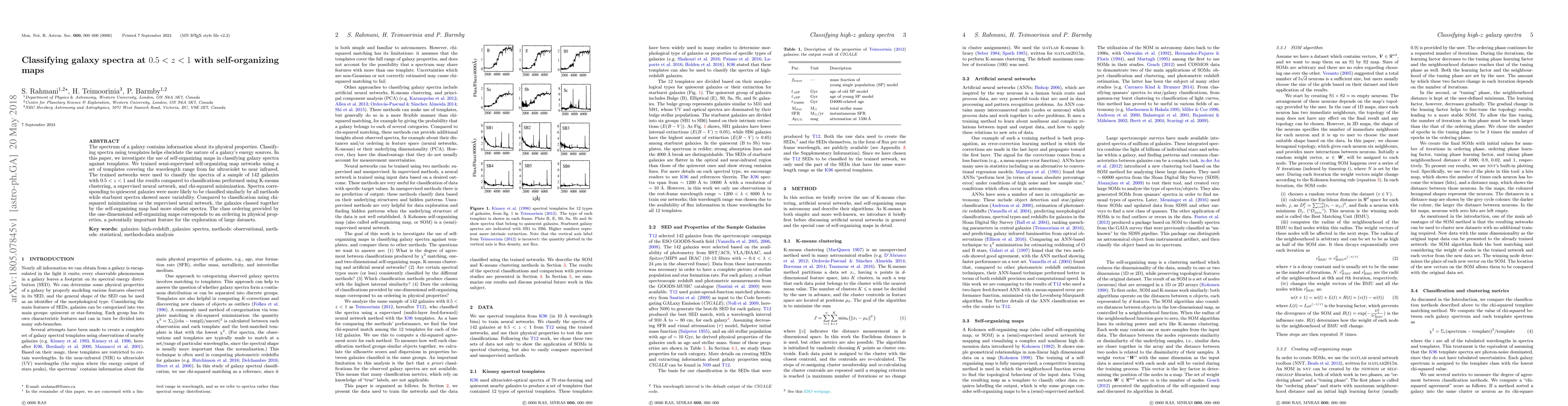 This paper explores the use of self-organizing maps to classify galaxy spectra in the redshift range 0.5 < z < 1, comparing results with K-means clustering, supervised neural networks, and chi-squared minimization. The self-organizing maps effectively grouped galaxies with similar spectra, particularly for quiescent galaxies, and provided an ordering in physical properties.