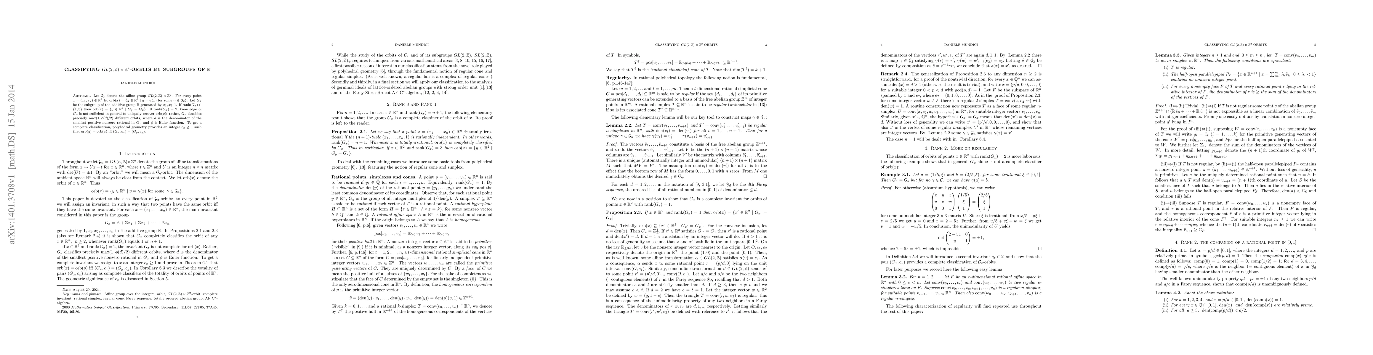 Let $\mathcal G_2$ denote the affine group $GL(2,\mathbb Z) \ltimes \mathbb Z^{2}$. For every point $x=(x_1,x_2) \in \R2$ let $\orb(x)=\{y\in\R2\mid y=\gamma(x)$ for some $\gamma \in \mathcal{G}_2 \}$. Let $G_{x}$ be the subgroup of the additive group $\mathbb R$ generated by $x_1,x_2, 1$. If $\rank(G_x)\in \{1,3\}$ then $\orb(x)=\{y\in\R2\mid G_y=G_x\}$. If $\rank(G_x)=2$, knowledge of $G_x$ is not sufficient in general to uniquely recover $\orb(x)$: rather, $G_x$ classifies precisely $\max(1,\phi(d)/2)$ different orbits, where $d$ is the denominator of the smallest positive nonzero rational in $G_x$ and $\phi$ is Euler function. To get a complete classification, polyhedral geometry provides an integer $c_x\geq 1$ such that $\orb(y)=\orb(x) $ iff $(G_{x},c_{x})=(G_{y},c_{{y}})$.